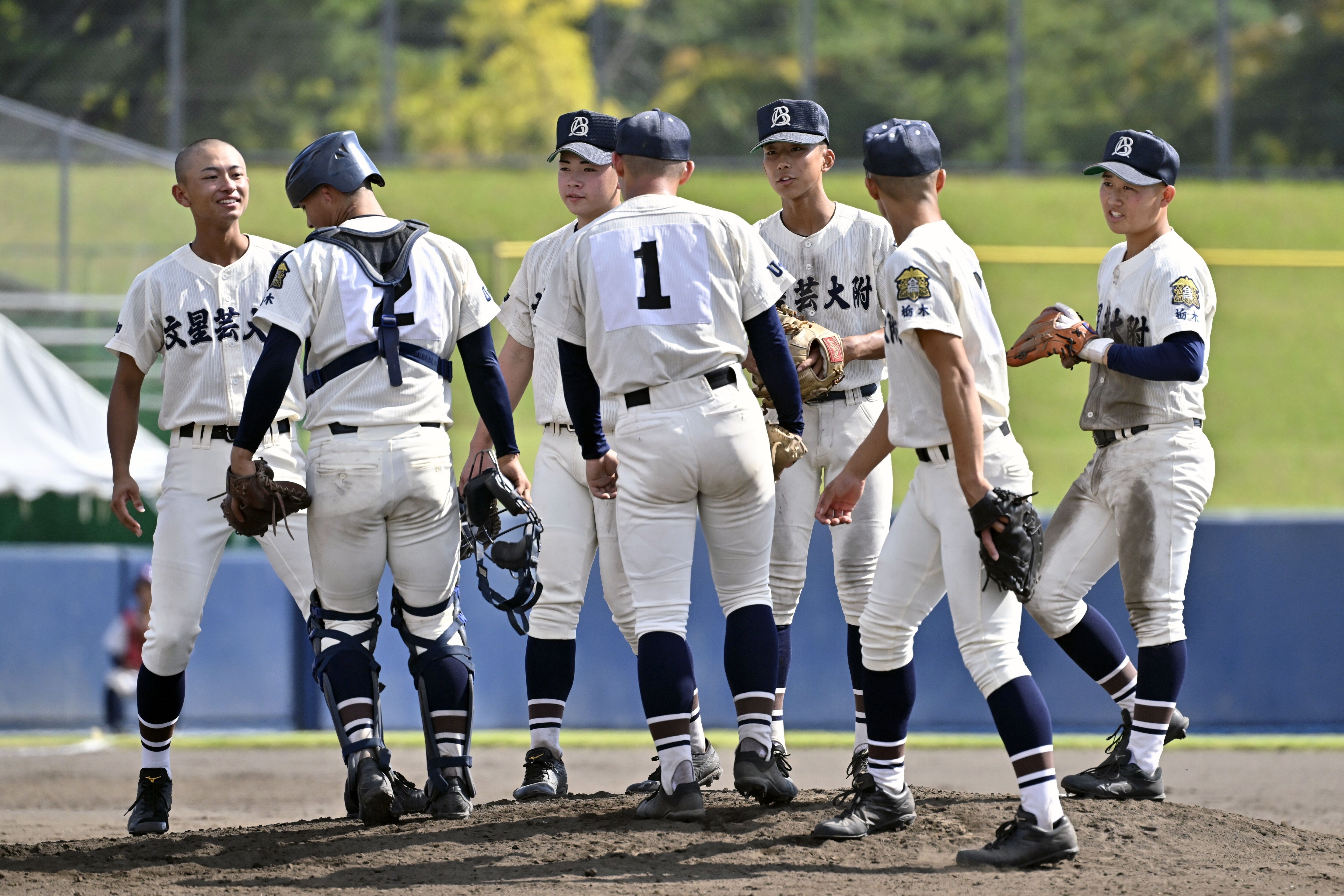 4回、1死一、二塁のピンチを迎え、マウンドに集まる文星付ナイン=甲府市の小瀬スポーツ公園山日YBS球場、広瀬華撮影