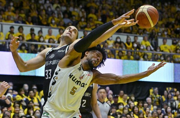 第4クオーター6分、ブレックスのエドワーズ(左)がゴール下でルーズボールに手を伸ばす=ブレックスアリーナ宇都宮、加藤竜矢撮影
