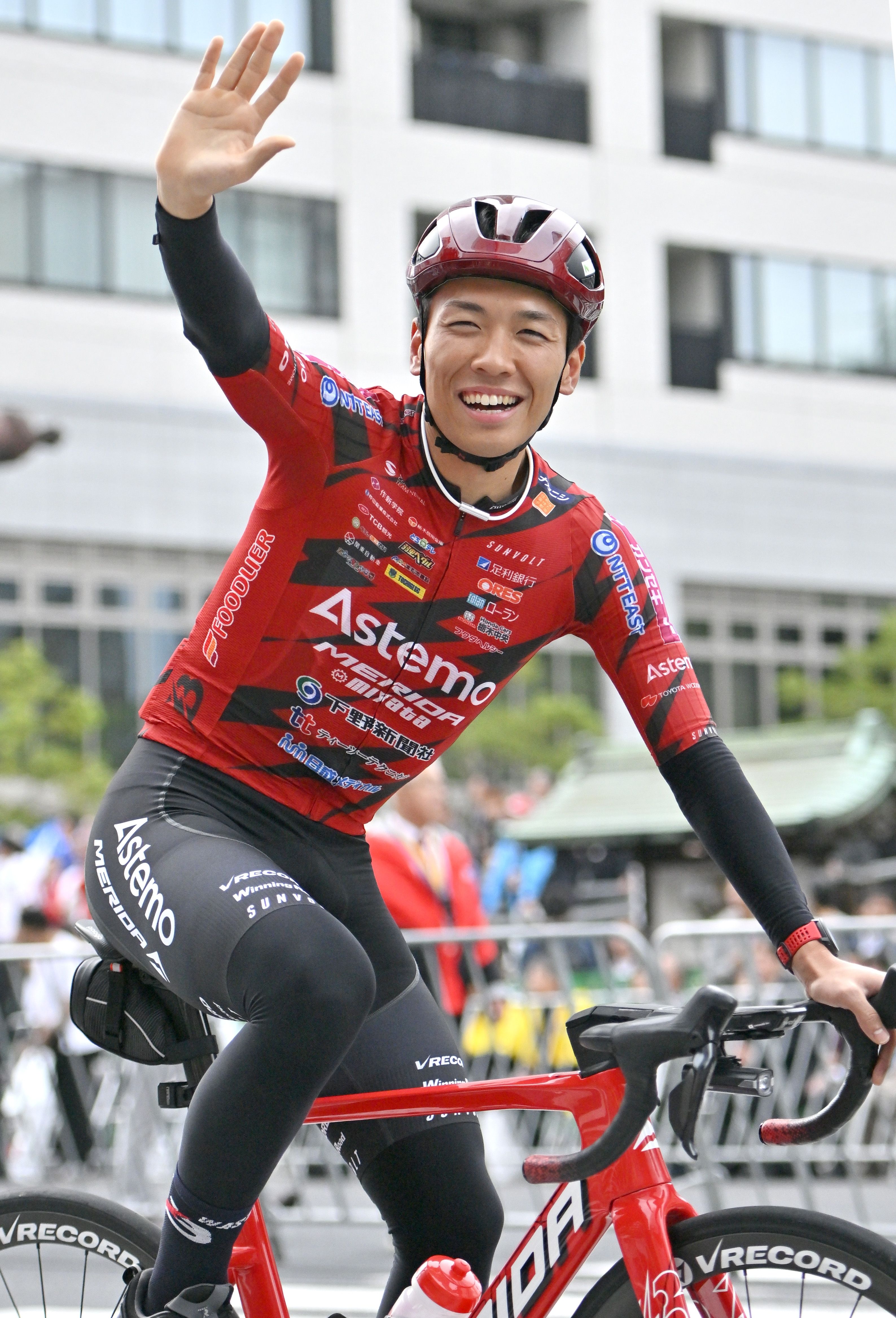沿道からの声援に応えるブリッツェンの小野寺
