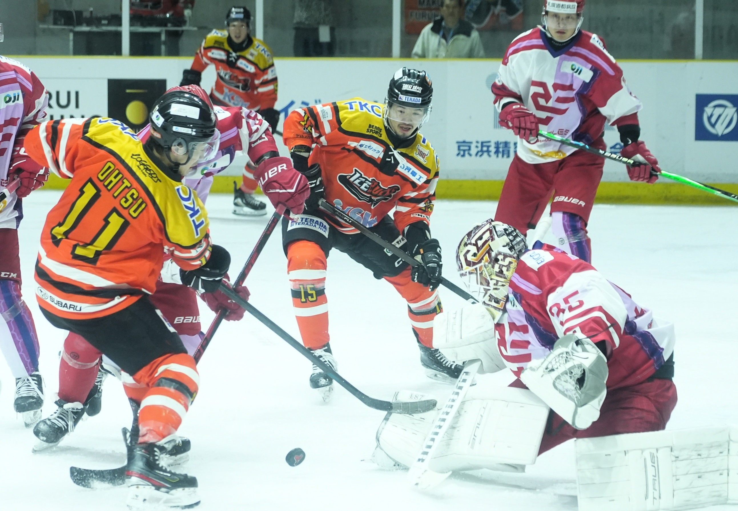 相手ゴールへ迫るバックスのFW大津(左)、FW村瀬(中央)ら=22日のホームRE北海道戦