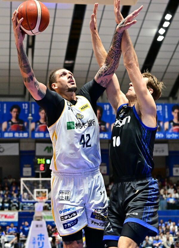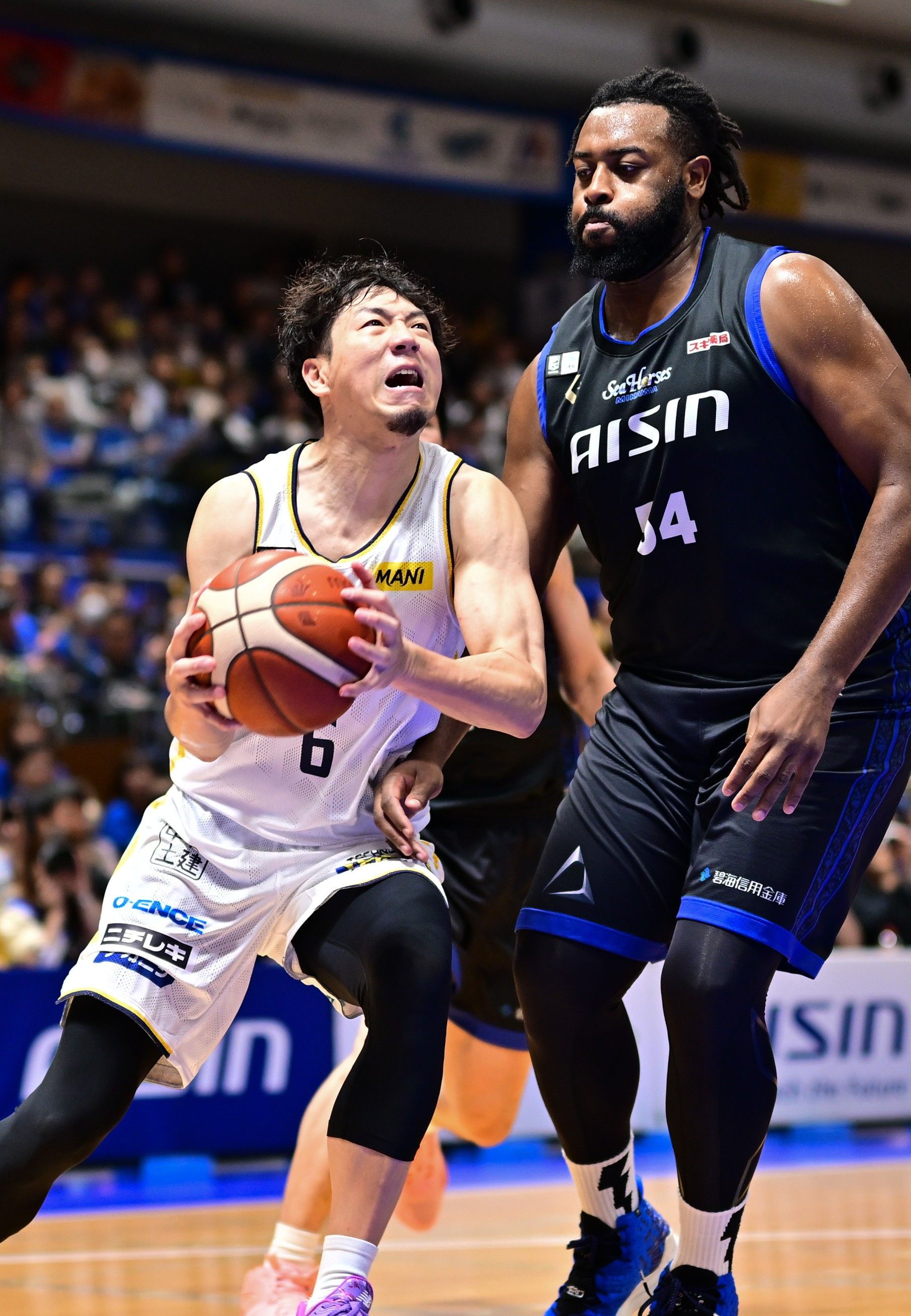 第1クオーター、シュートを決めるブレックスのフォトゥ(左)=ウィングアリーナ刈谷
