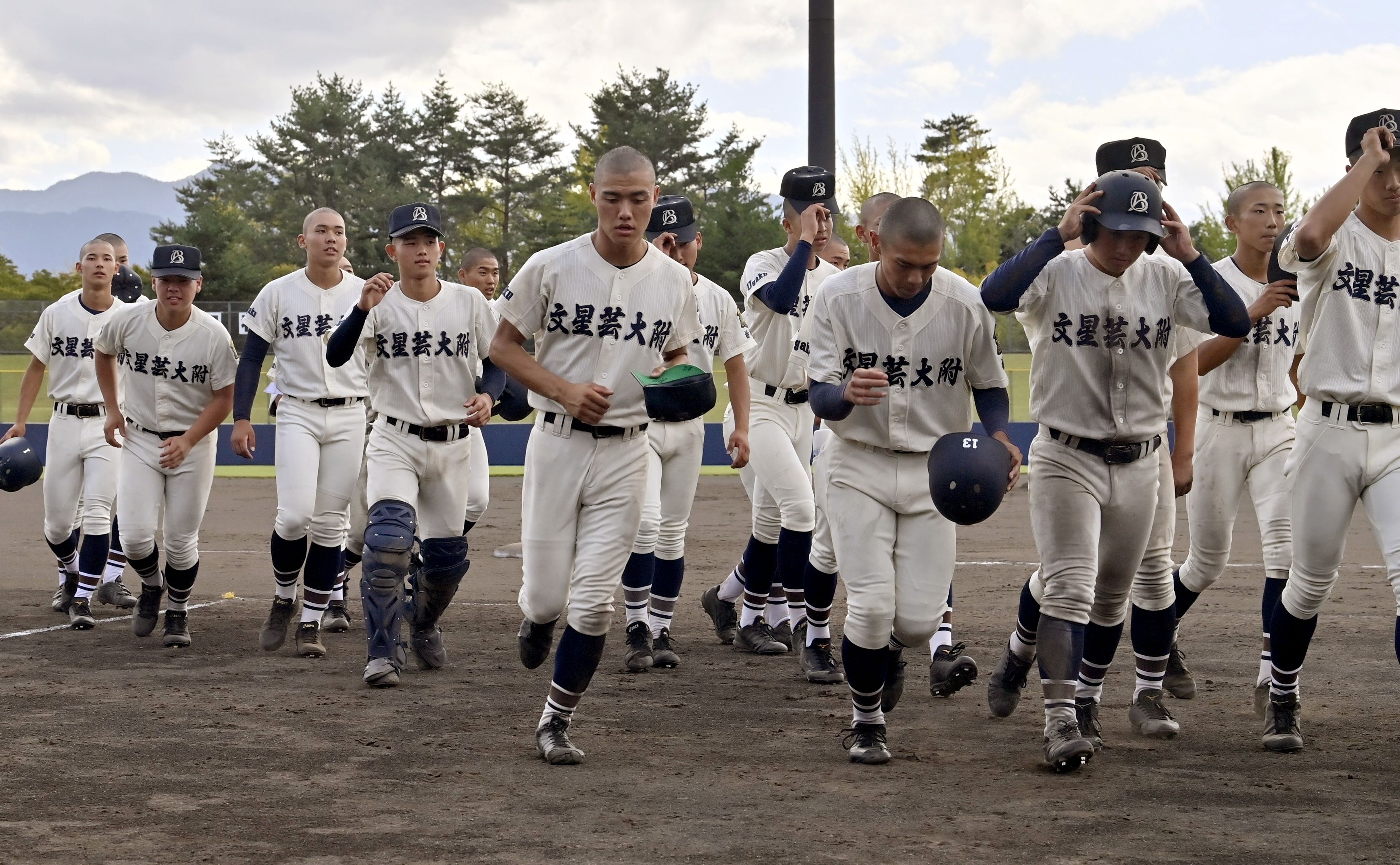 コールド負けを喫し、うつむきながらベンチへ引き揚げる文星付ナイン=甲府市の小瀬スポーツ公園山日YBS球場、広瀬華撮影