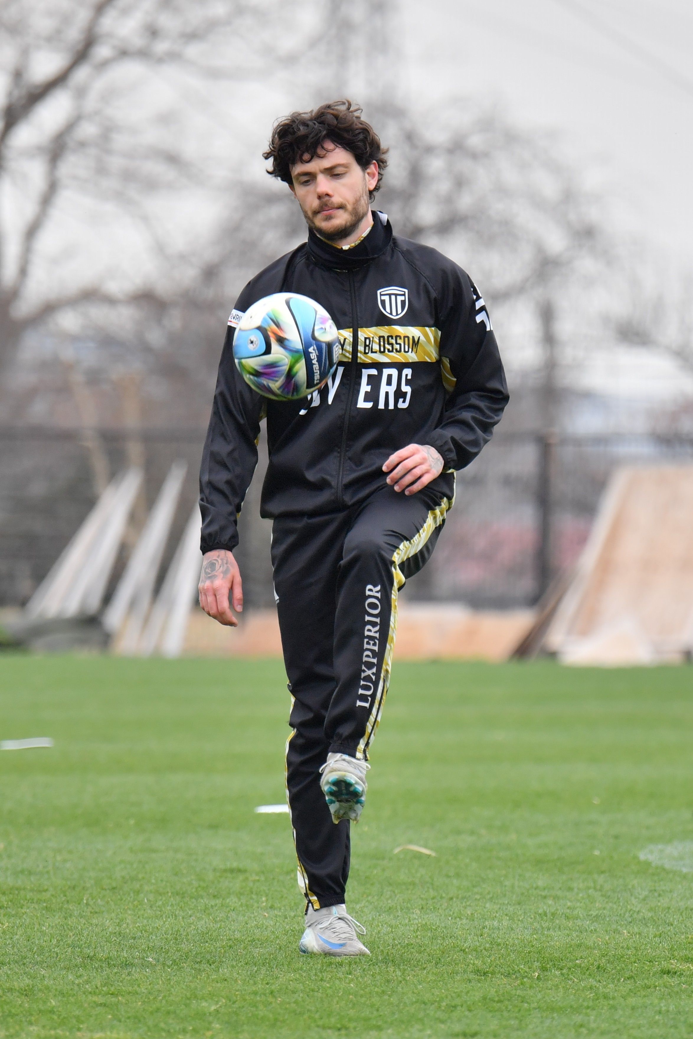 練習中にリフティングする栃木シティのFWモーベルグ=3月25日、シティフットボールステーションサブピッチ、鈴木航撮影