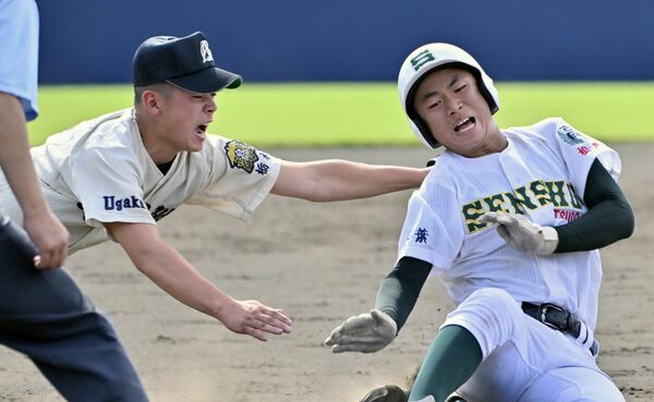 6回、文星付の三塁手・蛭田(左)が飛び出した二走をタッチアウト=甲府市の小瀬スポーツ公園山日YBS球場、広瀬華撮影