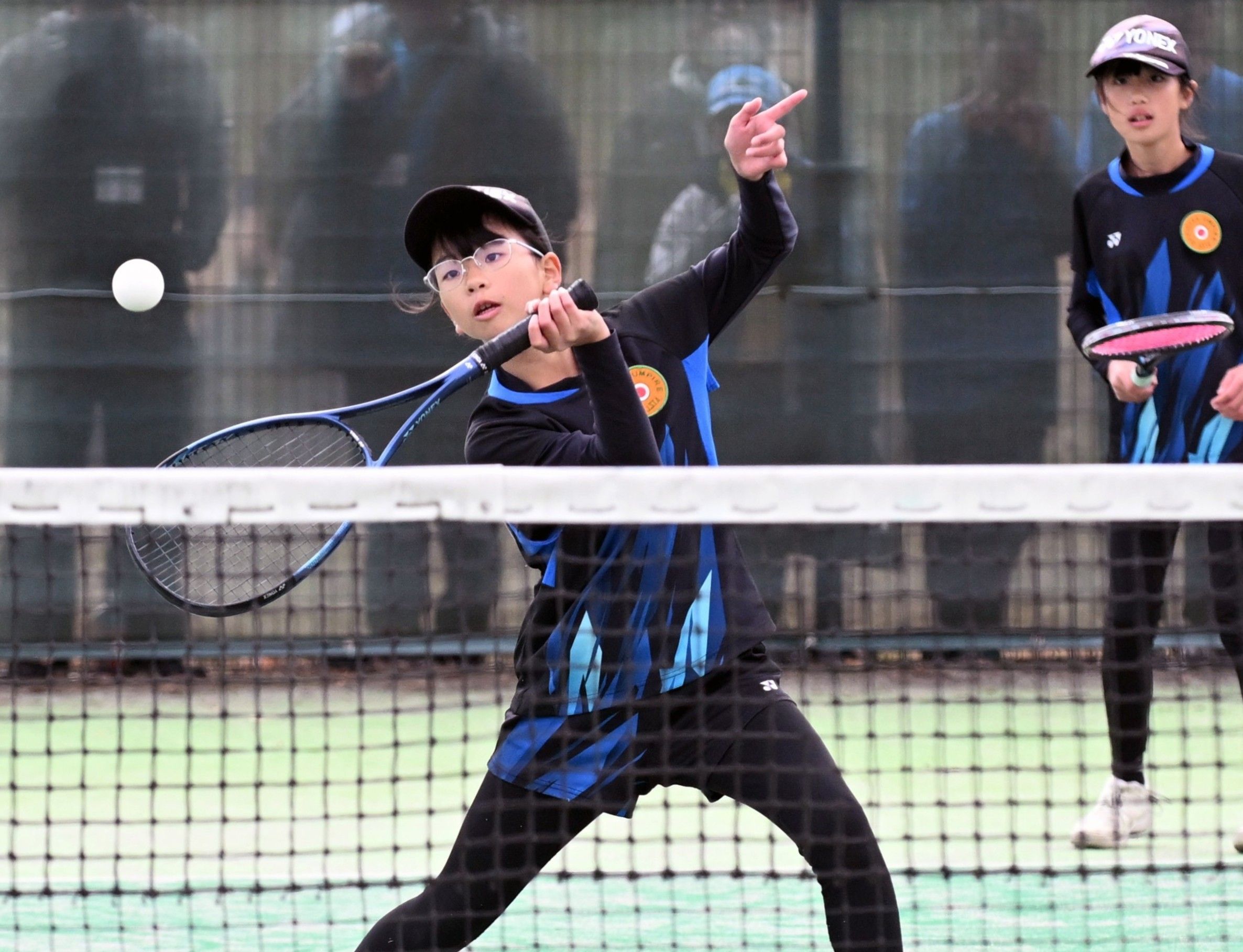 女子5年 笹森・佐藤組(BC-F)-矢田部・平久組(野木)決勝 第3ゲーム、笹森がボレー。右奥は佐藤=丸山公園