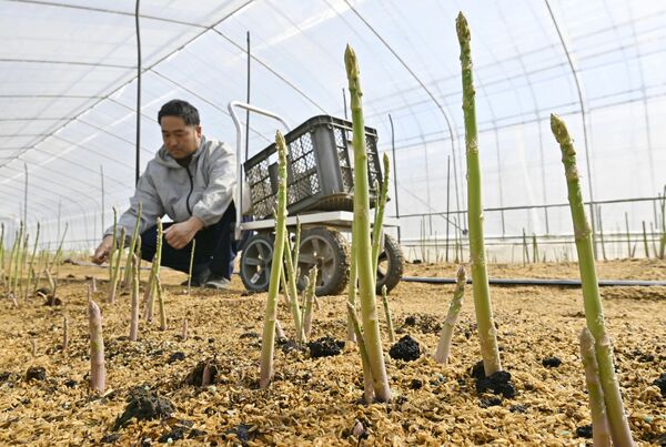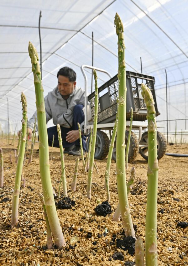 収穫期を迎えたみずみずしいアスパラガス=28日午後1時5分、上三川町磯岡