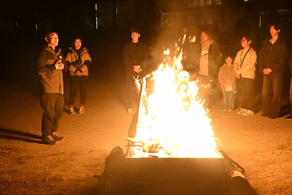 火を囲みながら白石専務(左)の話に耳を傾ける生徒たち
