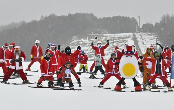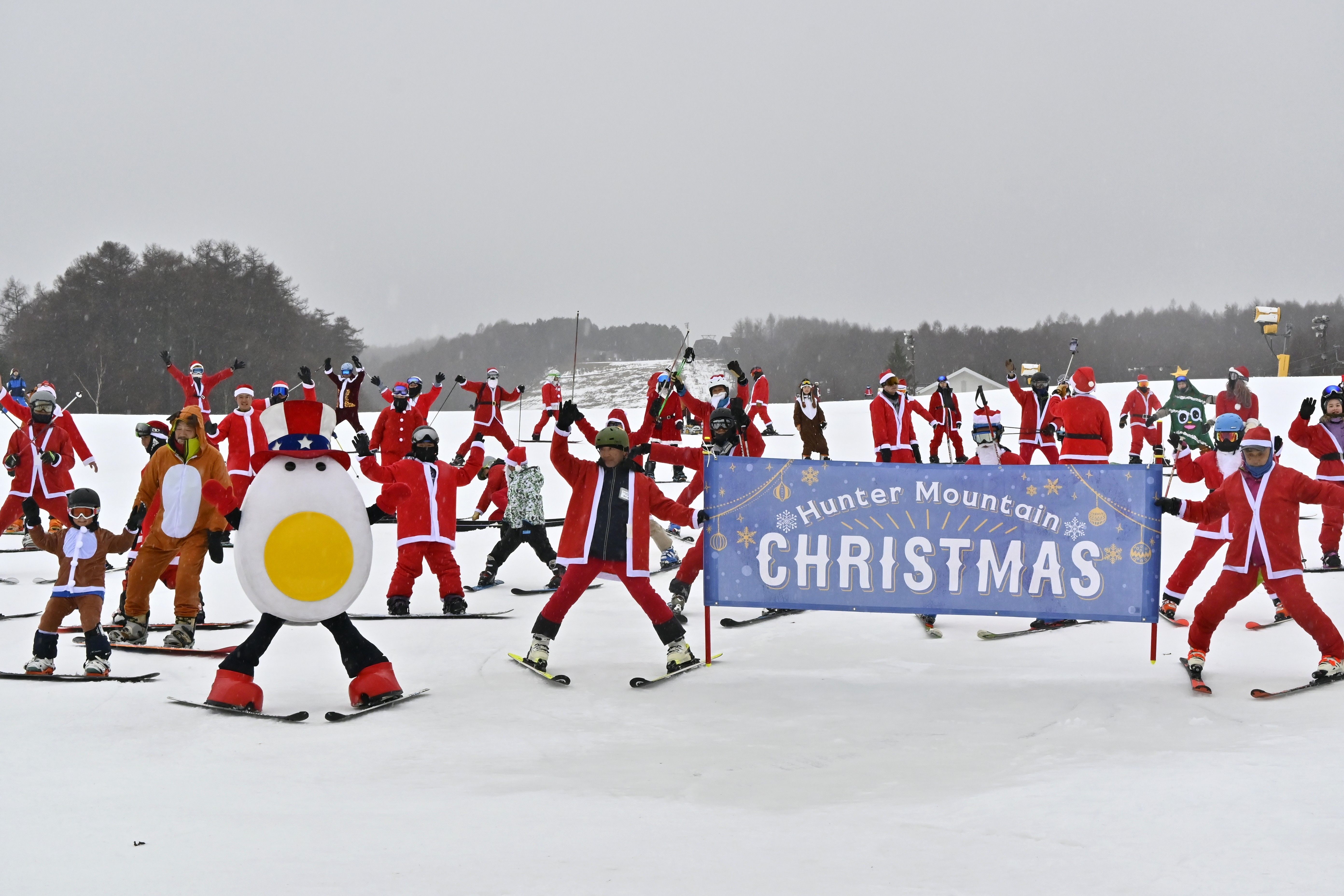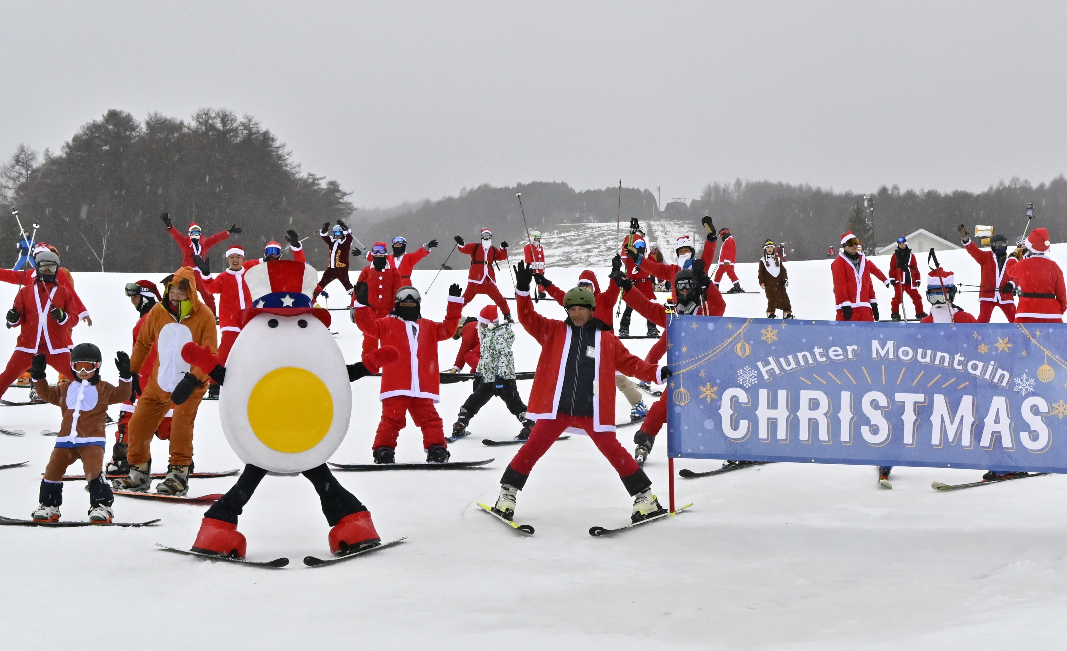 サンタクロース姿などで一斉に滑走する来場客ら=24日午前、那須塩原市湯本塩原