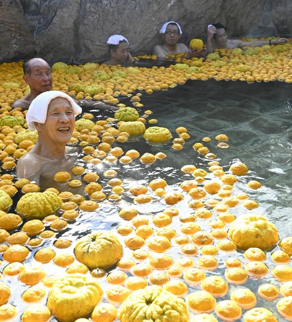 一面にユズが浮かぶ露天風呂を楽しむ温泉客