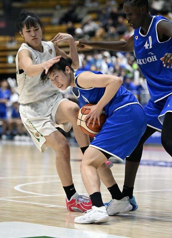 第3クオーター3分、白鴎大の佐坂(中央)がゴール下で競り合う=東京都大田区の大田区総合体育館、森田大地撮影