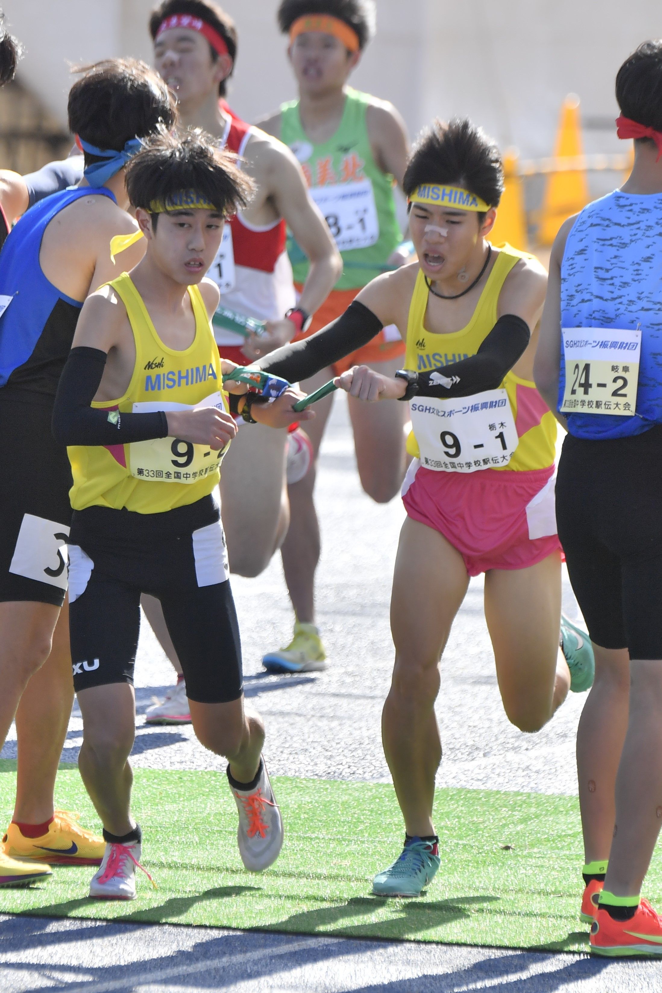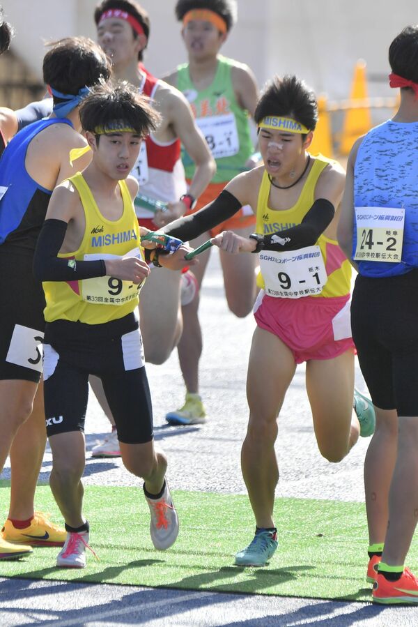 男子三島の1区本多(右)から2区石山にたすきをつなぐ