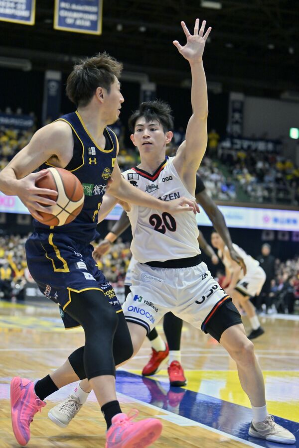 懸命の守備を見せる白鴎大出身の三遠・根本(右)=ブレックスアリーナ宇都宮、広瀬華撮影