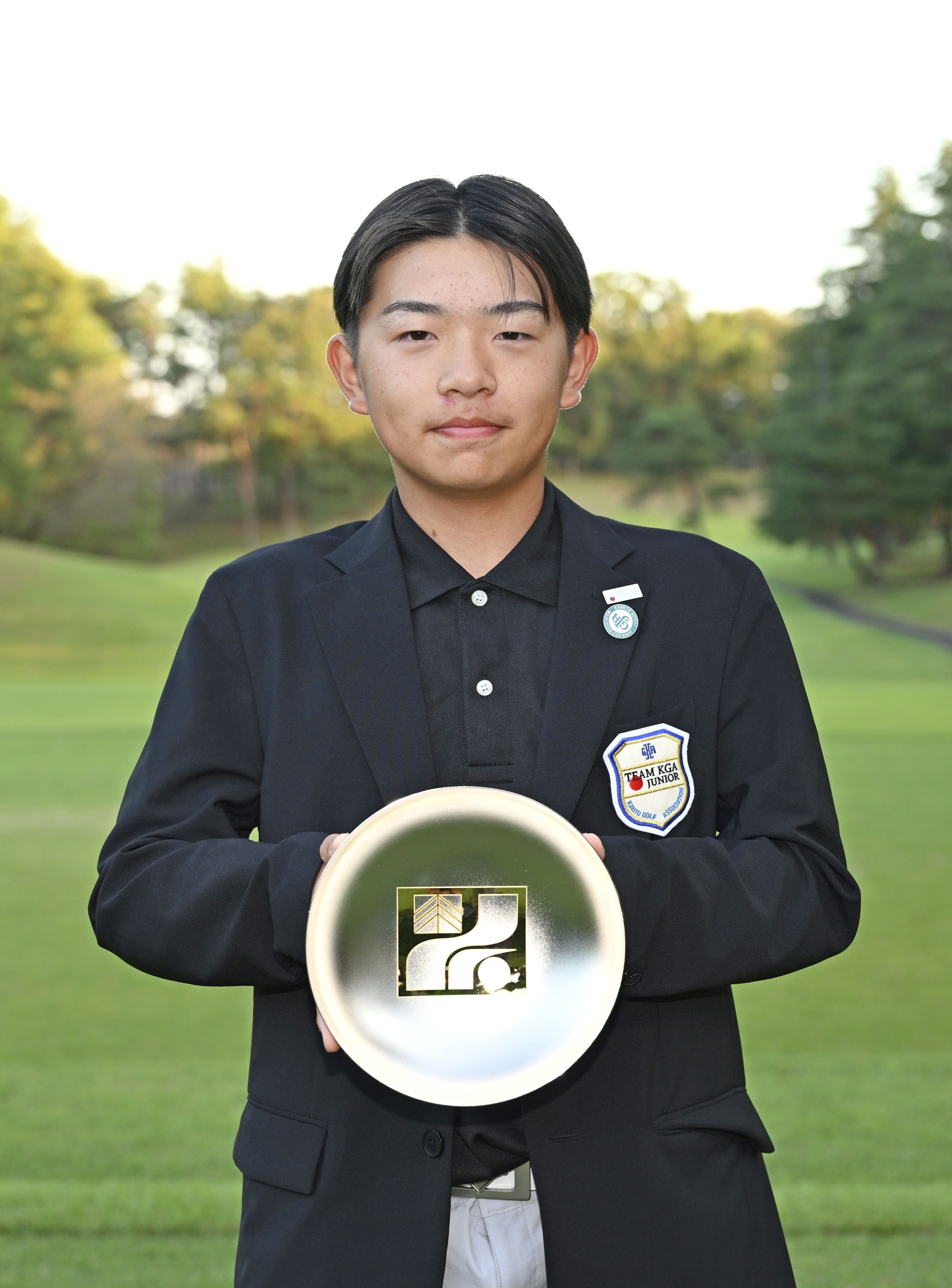 一般男子の部で最年少優勝し、知事盃を手にする小筆(那須塩原)=17日午後4時25分、市貝町の芳賀CC、森田大地撮影