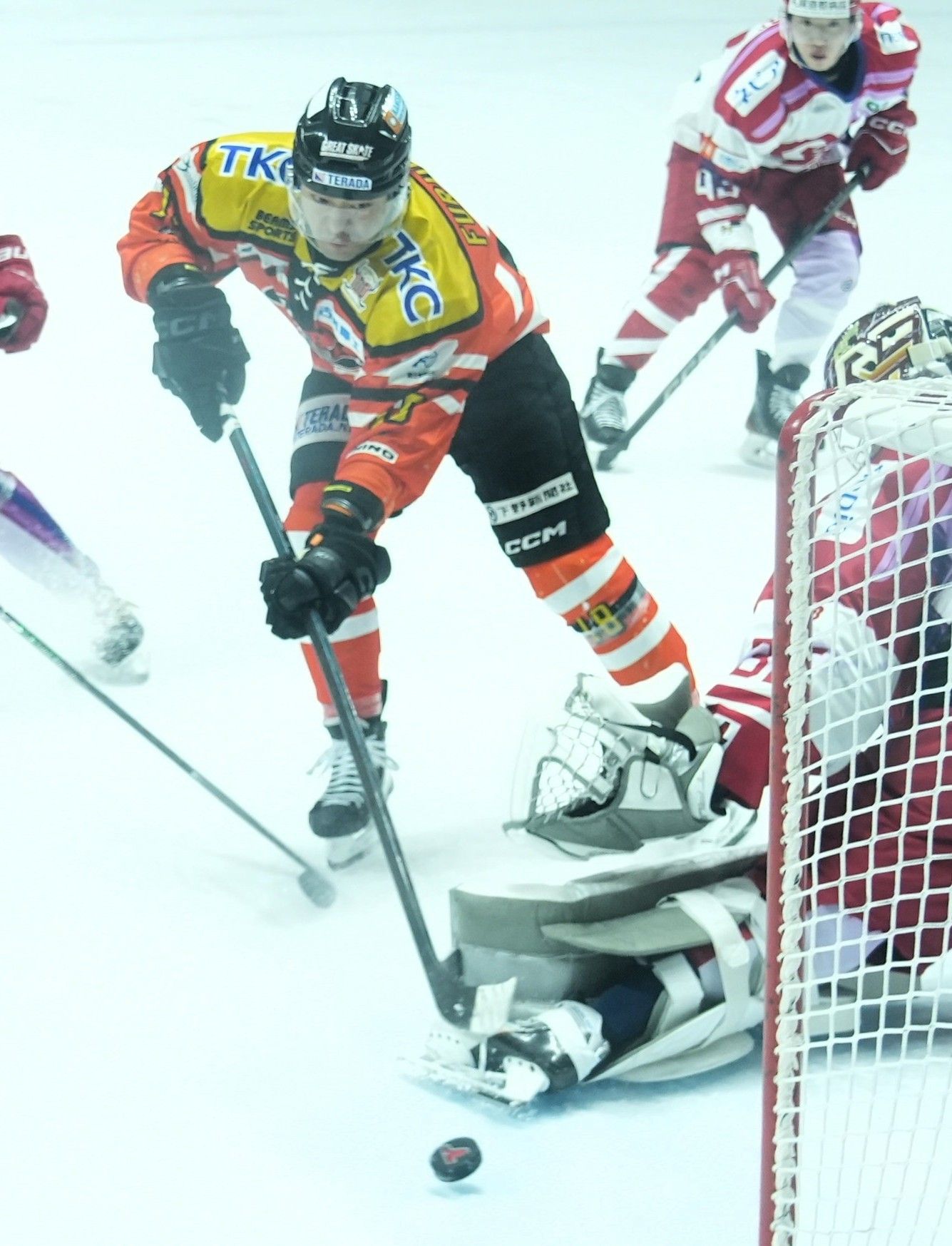第3ピリオド13分、バックスのFW古橋がゴールを狙う=日光霧降アイスアリーナ、橋本裕太撮影