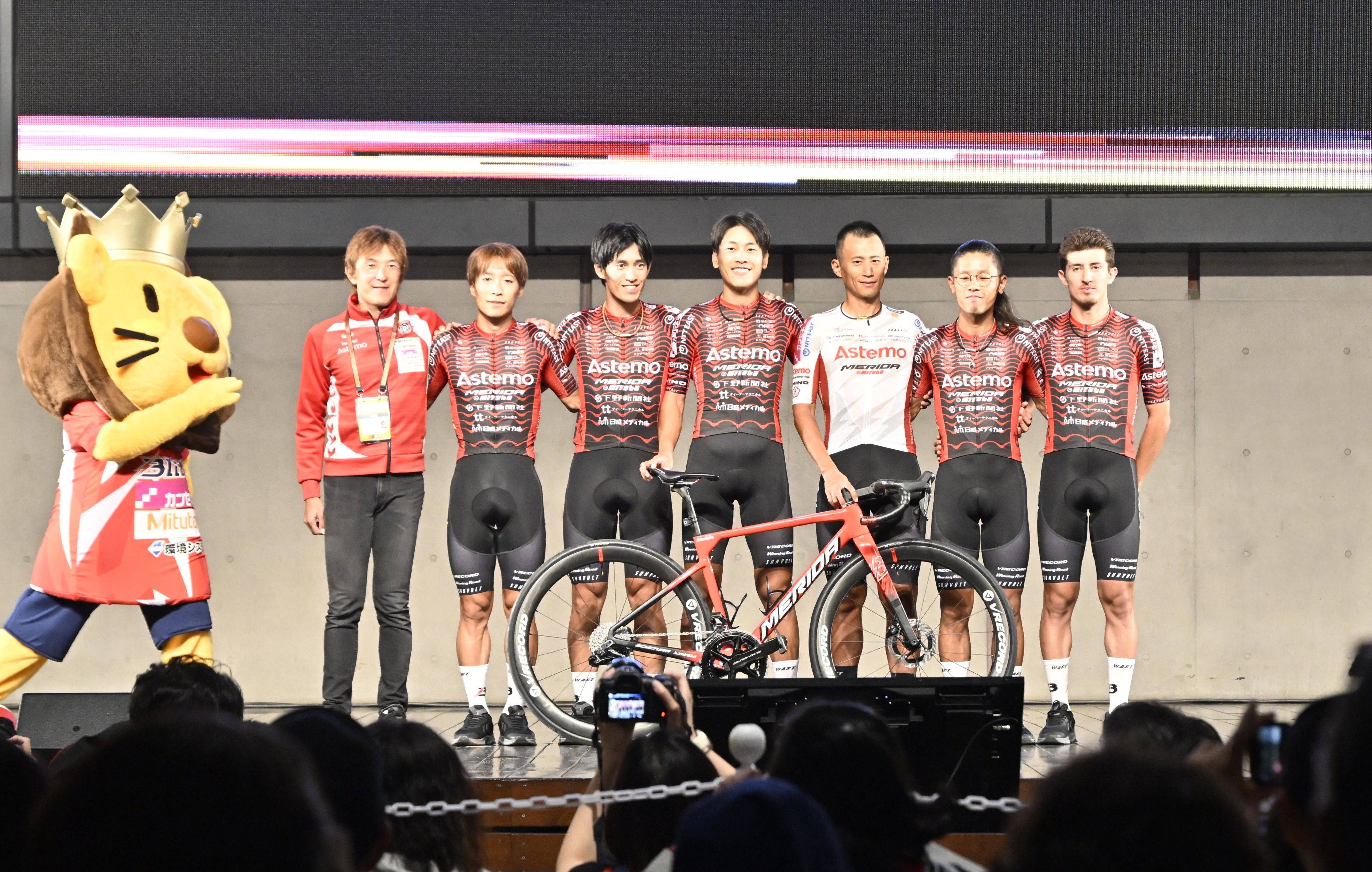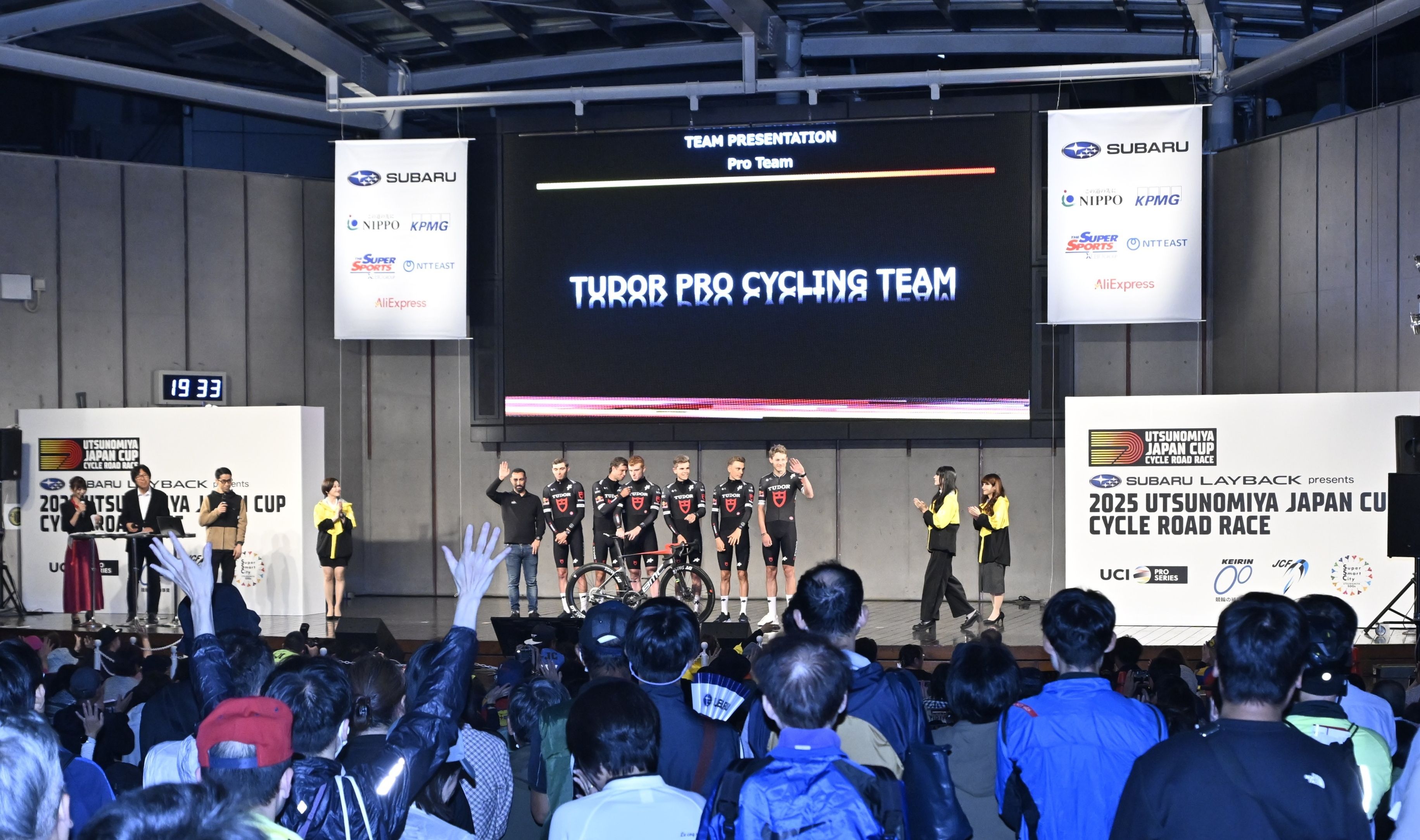 チームプレゼンテーションで歓声を浴びるブリッツェンの選手たち=17日夜、宇都宮市江野町