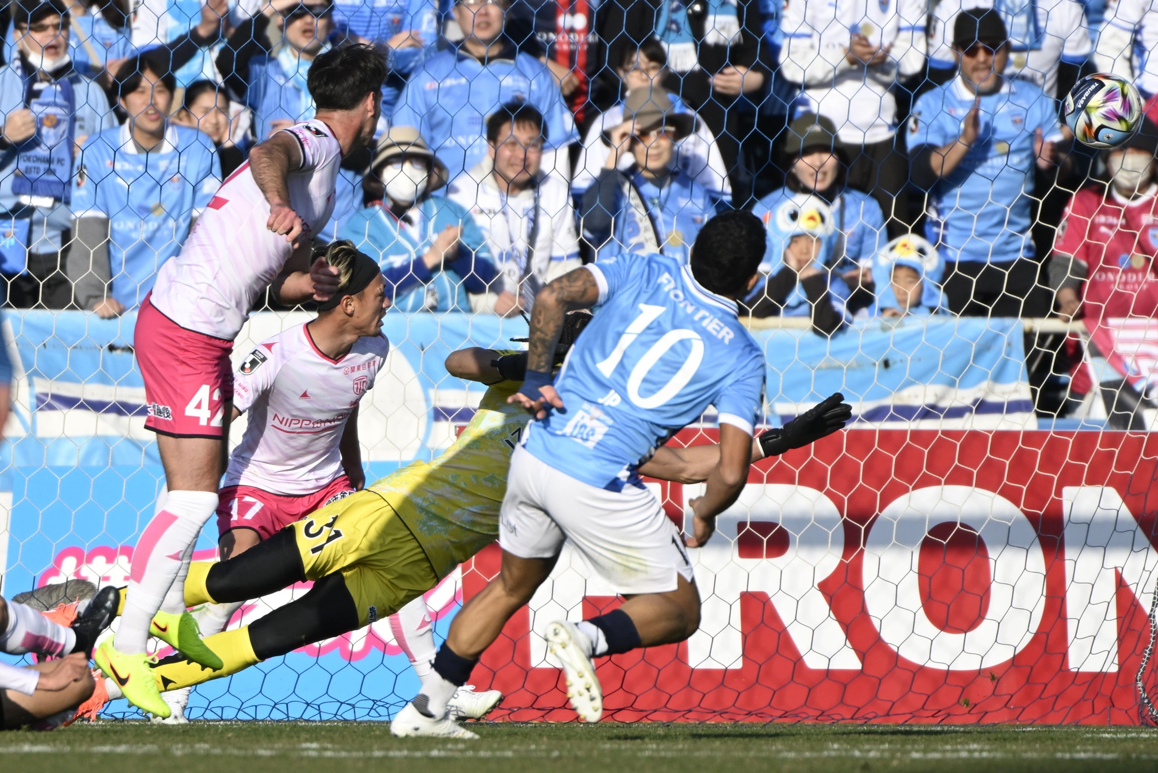 後半追加タイム、5点目を許す栃木シティの(左から)DFヨニッチやDF知念ら=ニッパツ三ツ沢球技場、森田大地撮影