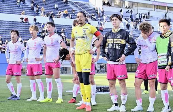 後半追加タイム、5点目を奪われ、肩を落とす栃木シティのGK相澤(中央)やDF下田(右)ら=横浜市のニッパツ三ツ沢球技場、森田大地撮影