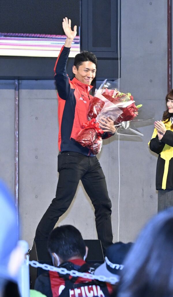 引退を発表し拍手で見送られるブリッツェンの小野寺=オリオンスクエア