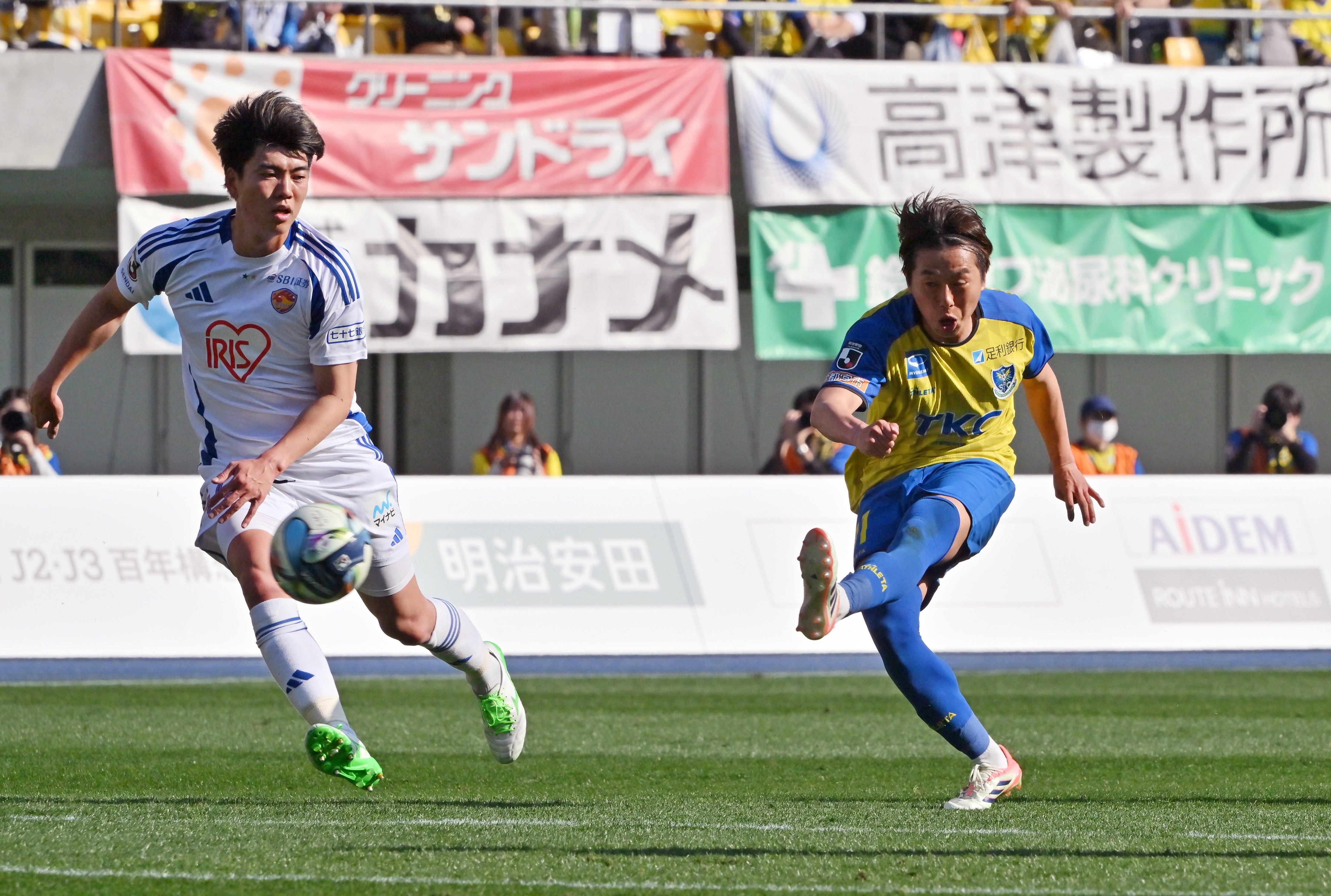 前半23分、栃木SCのMF中野(右)がシュートを放つ=カンセキスタジアムとちぎ、河野光吉撮影