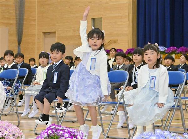 入学式で名前を呼ばれ、元気よく返事をする新入生=10日午前10時、那須塩原市下永田8丁目(写真は一部加工しています)