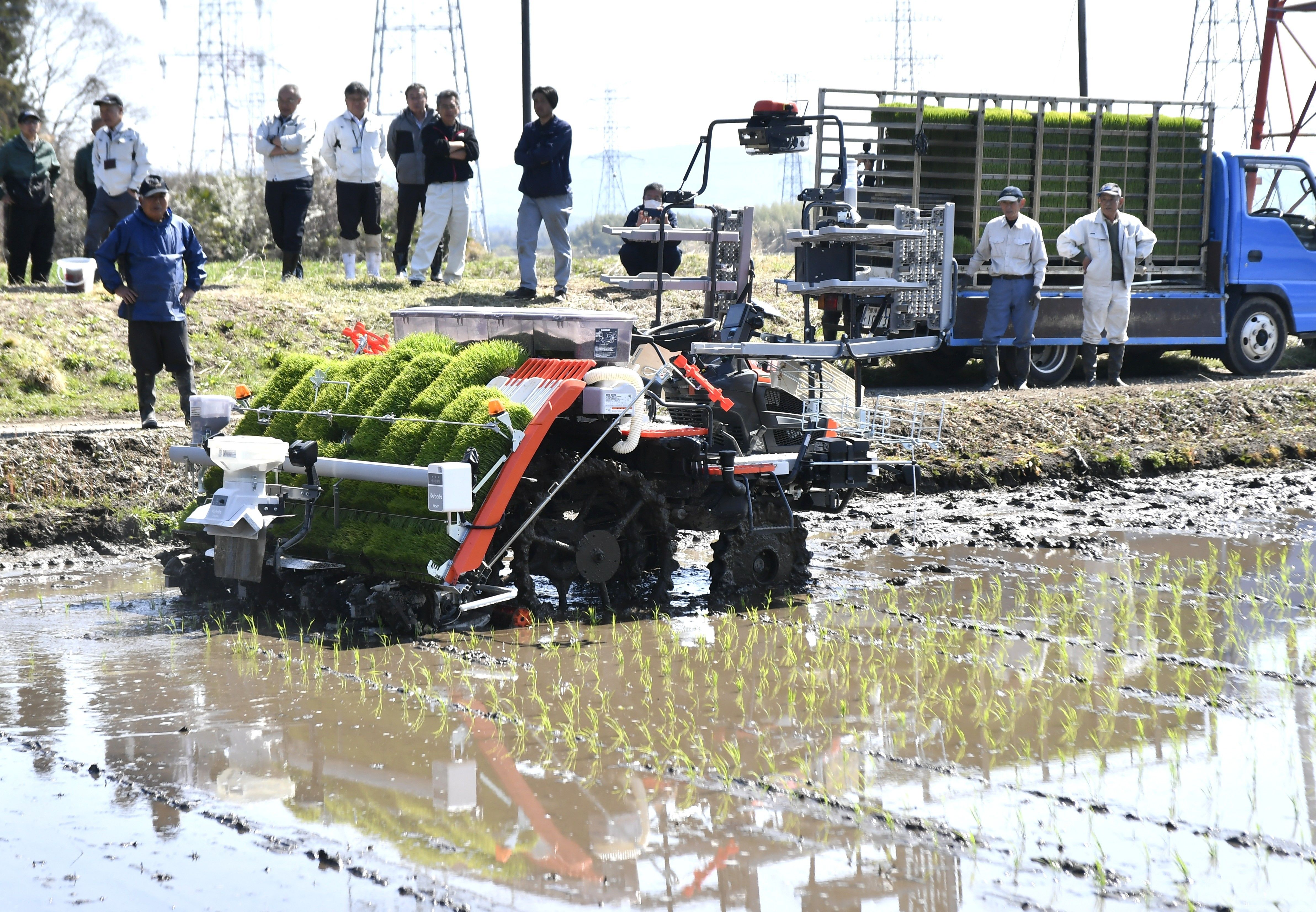 無人で動く自動運転の機械が用いられた田植え作業=3日午前10時、大田原市滝岡