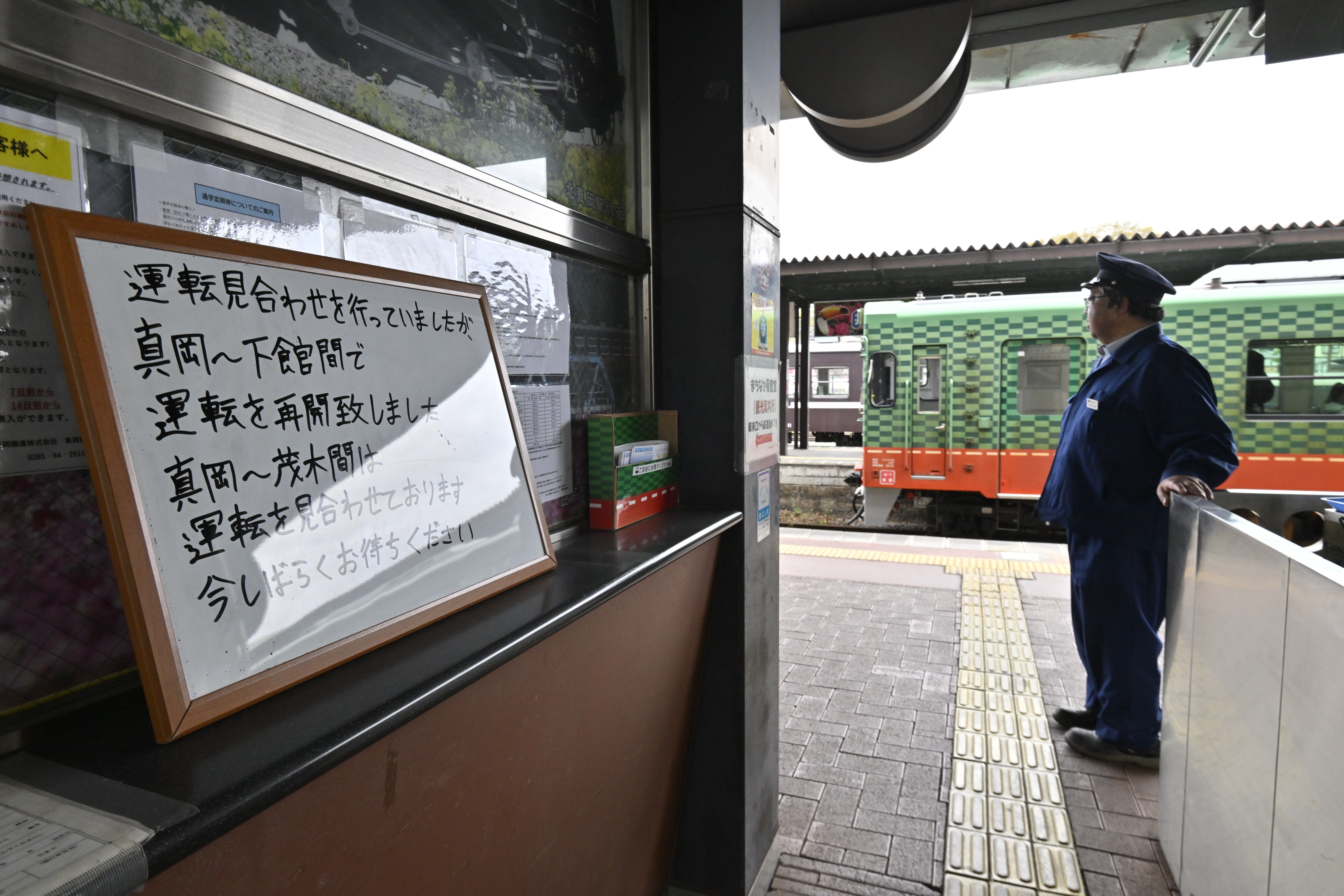 地震による運転見合わせを知らせる白板と、下館~真岡駅間の部分再開後、最初に真岡駅に到着した下り列車=1日午前11時35分、真岡駅、森田大地撮影
