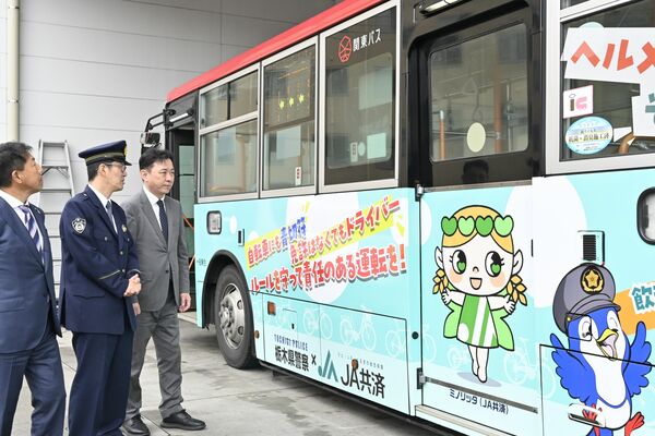 刷新されたラッピングバスを見学する出席者=31日午前、宇都宮市簗瀬4丁目