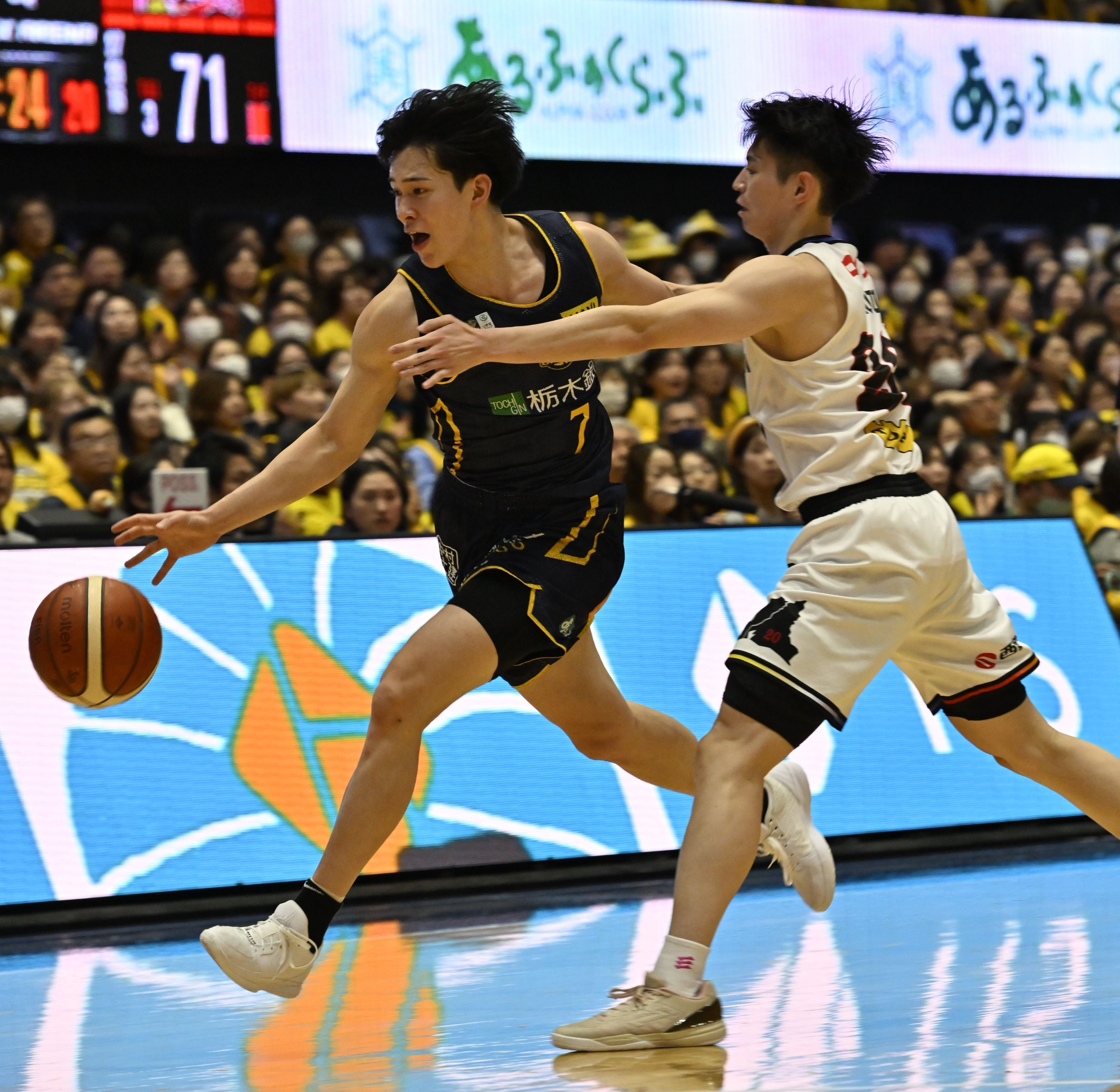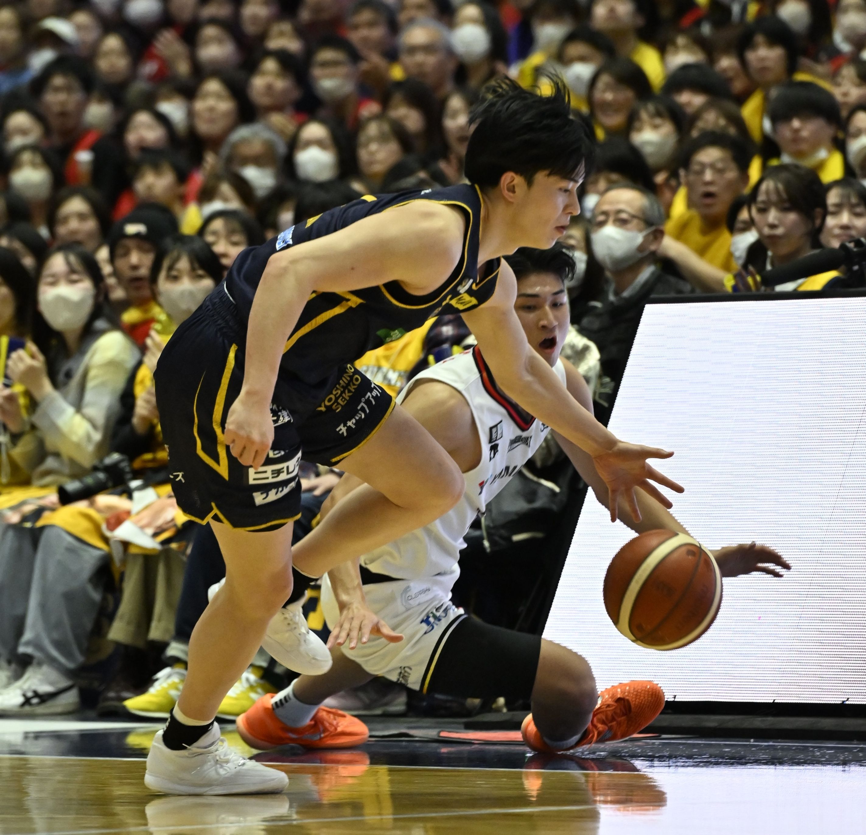 第2クオーター8分、ブレックスの小川が体を張った守備からスチール=ブレックスアリーナ宇都宮