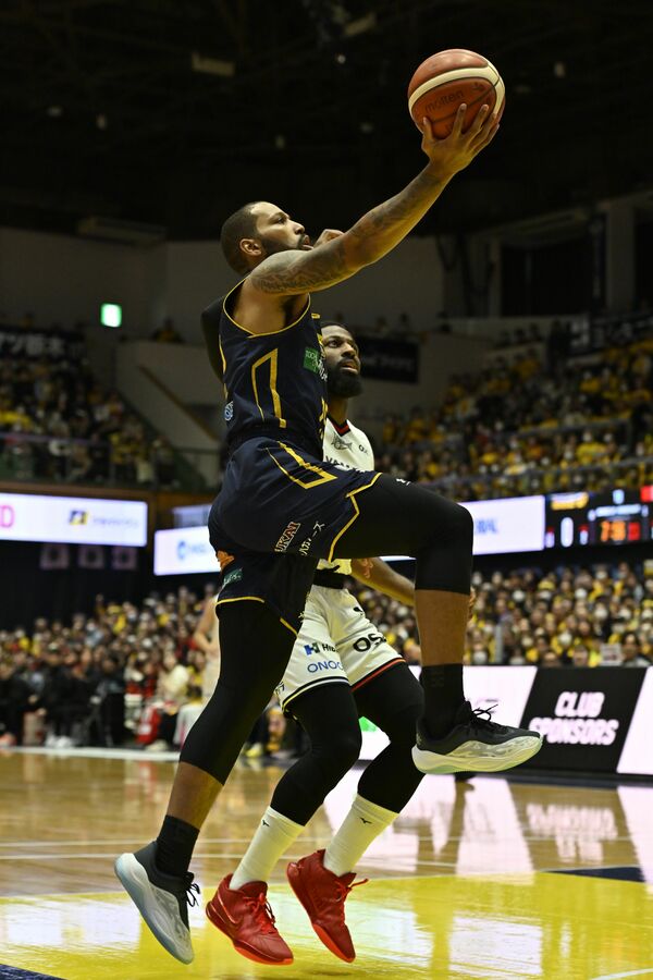 第1クオーター3分、ブレックスのニュービルがドライブからレイアップシュートを決める=ブレックスアリーナ宇都宮