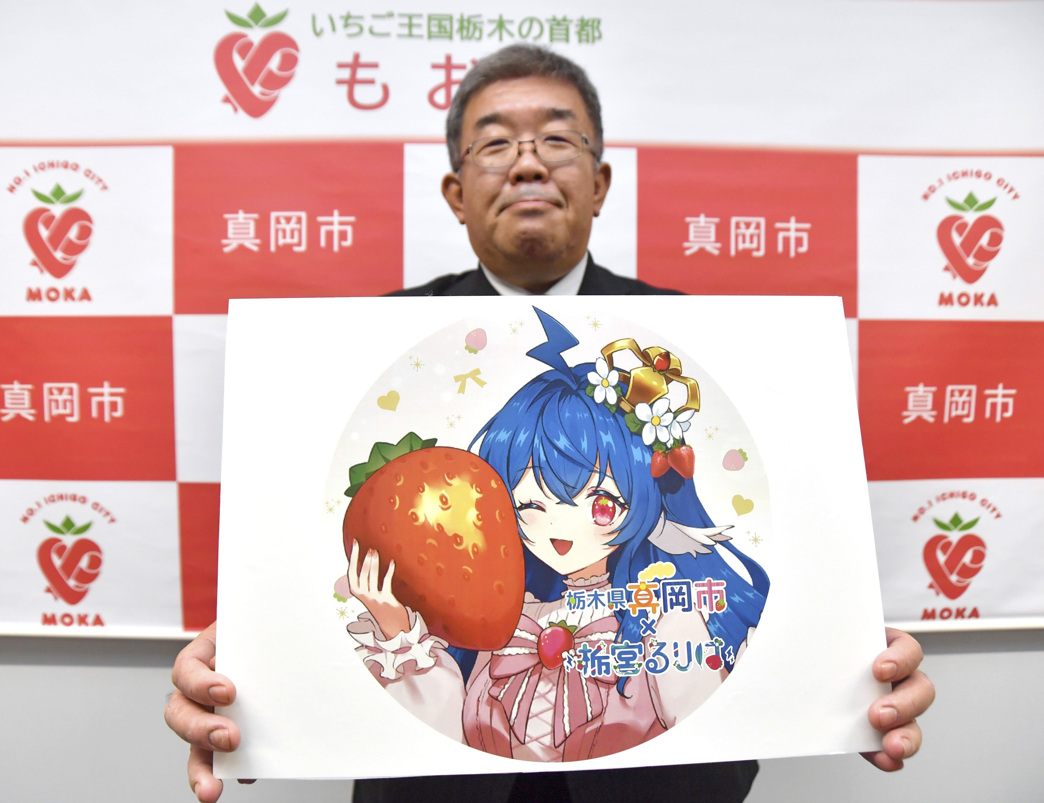 大川市長(右)にサイン入りのポスターを手渡した八津さん=17日午後、栃木市役所