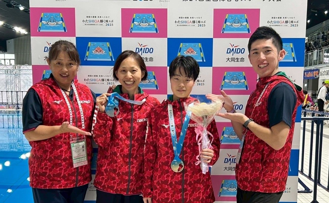 第24回全国障害者スポーツ大会の水泳で金メダルを獲得した窪田さん(中央右)と落合さん(中央左)