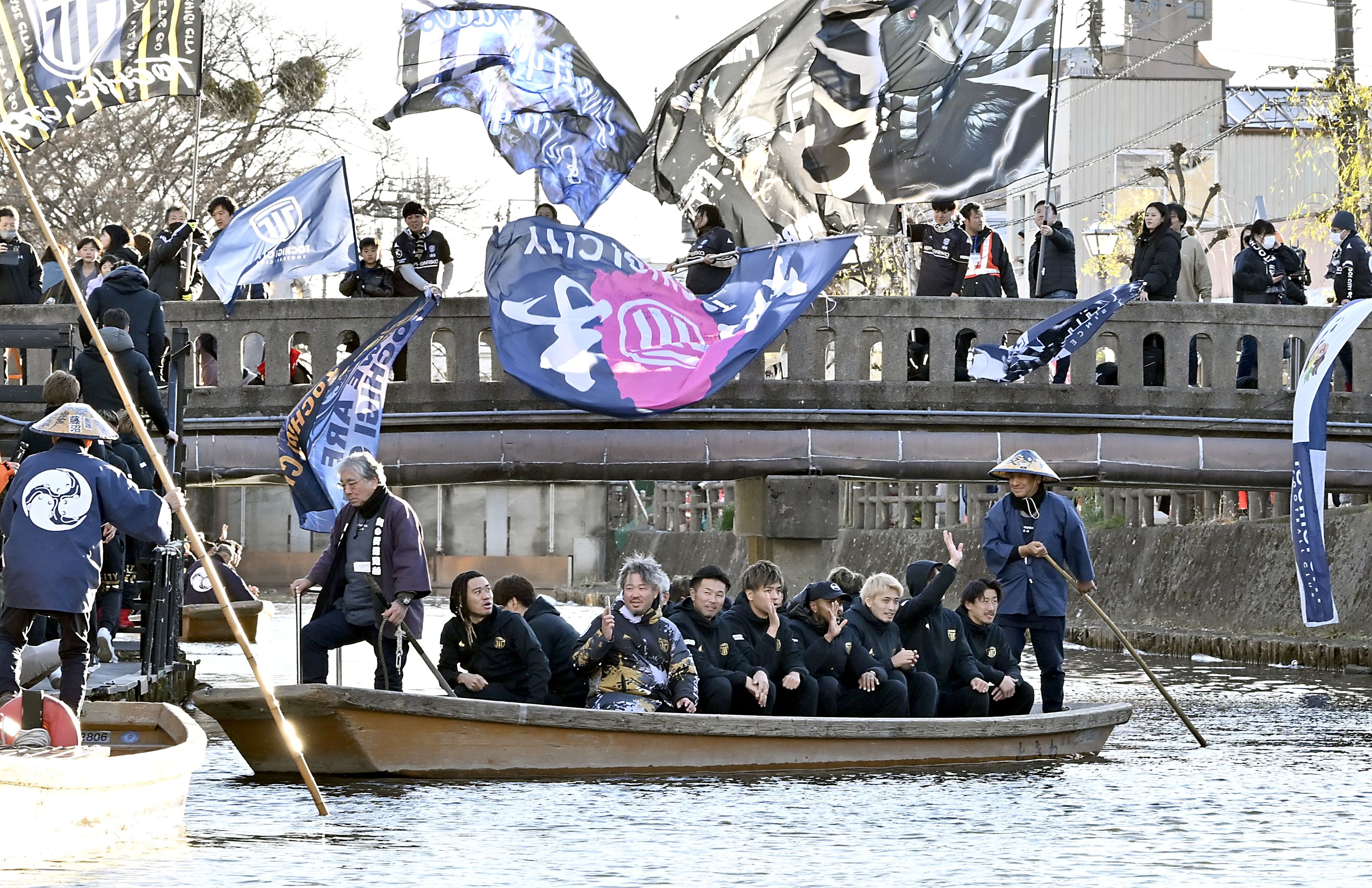 巴波川橋の上でサポーターが大旗を振る中、船上パレードを行う栃木シティの選手ら=11日午後3時30分、栃木市湊町
