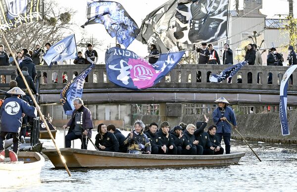 蔵が並ぶ巴波川で船上パレードする栃木シティの選手ら=11日午後3時20分、栃木市湊町