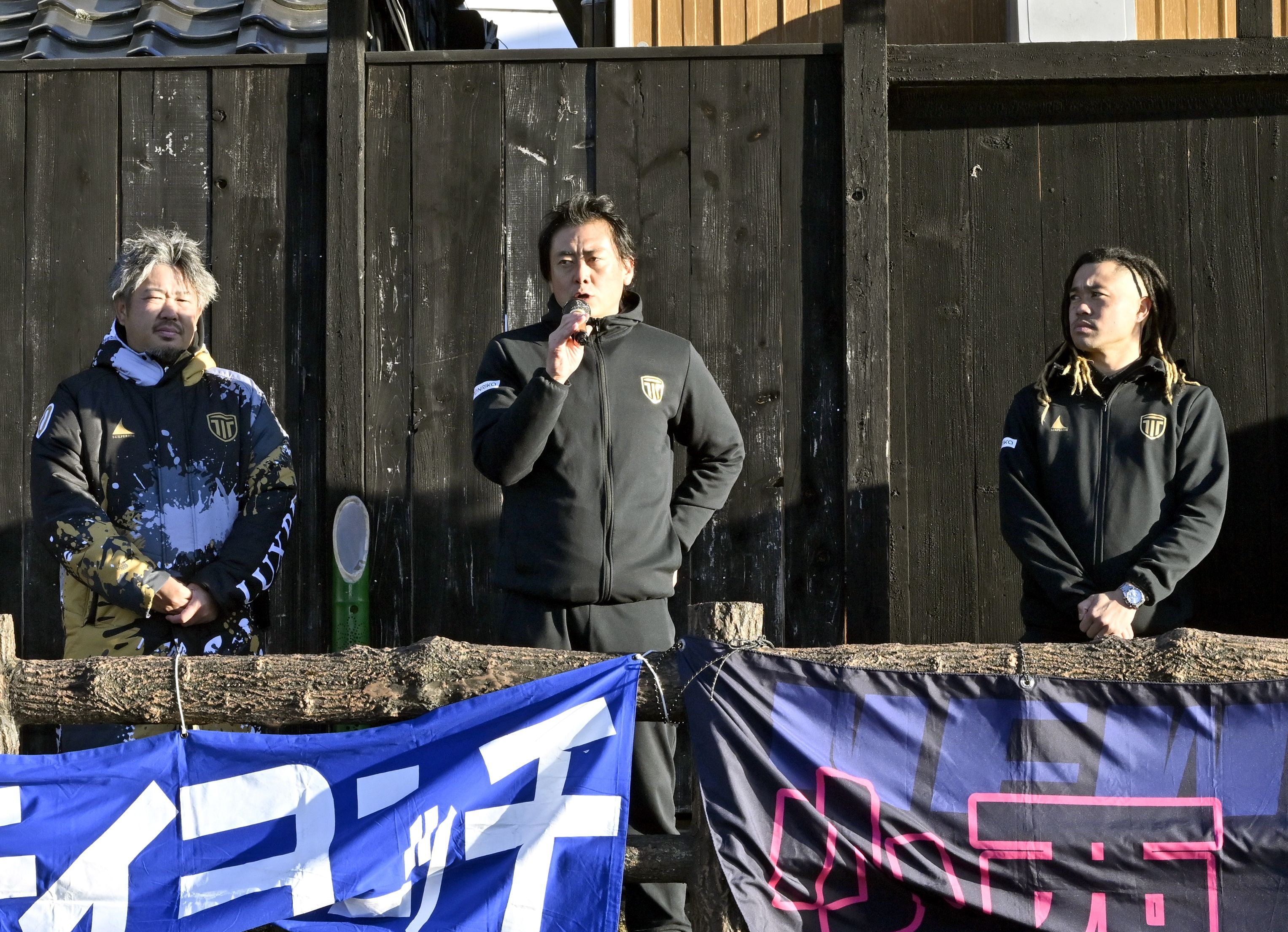 駆けつけたサポーターに向けてあいさつをする栃木シティの今矢監督(中央)ら