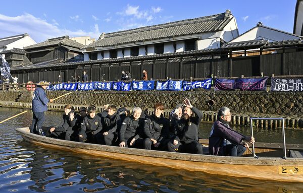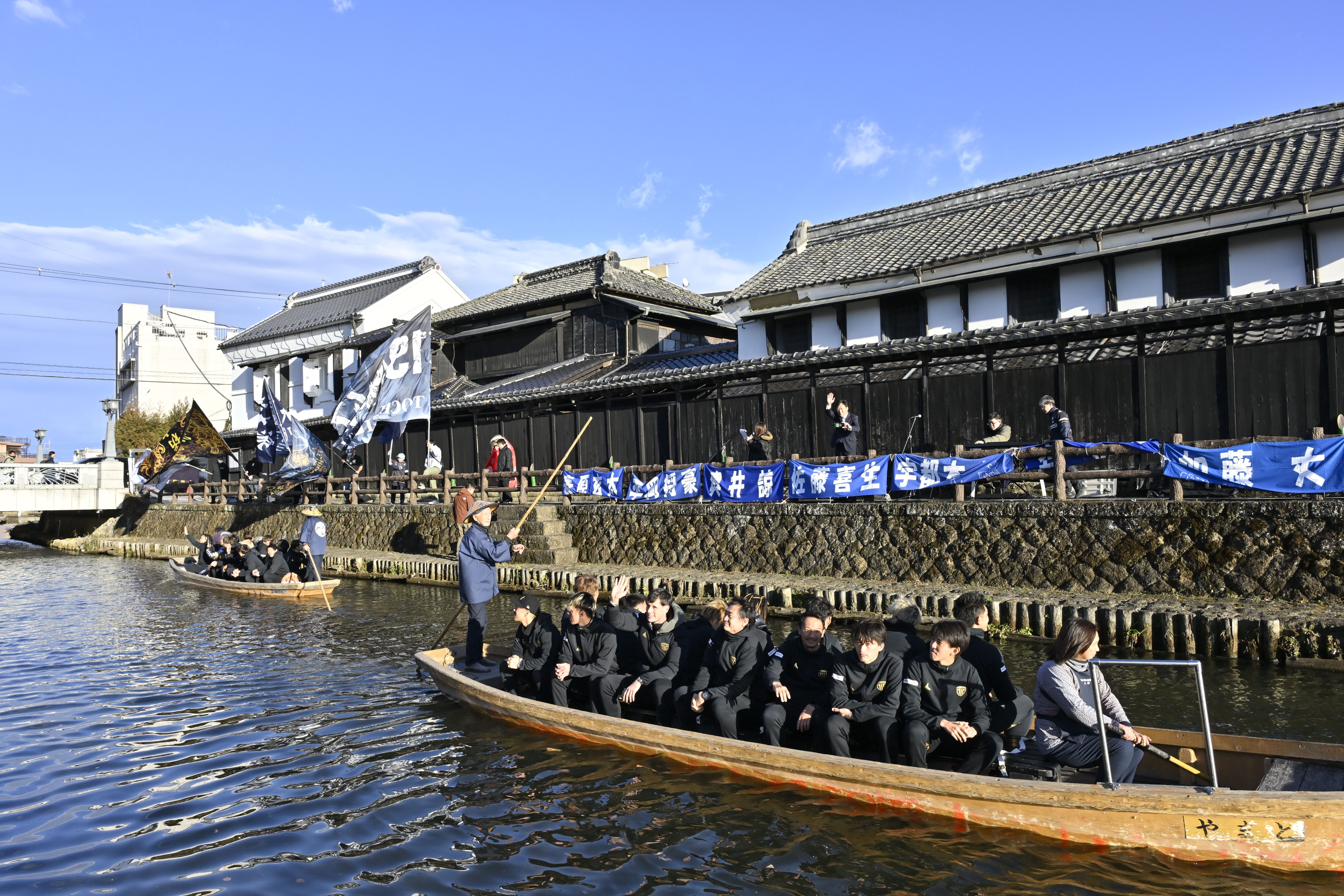 蔵が並ぶ巴波川で船上パレードする栃木シティの選手ら=11日午後3時15分、栃木市湊町