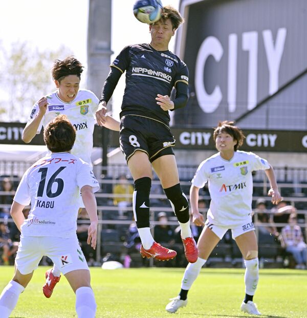 前半追加タイム、栃木シティのFW山下が頭でシュートを放つ=シティフットボールステーション、加藤竜矢撮影