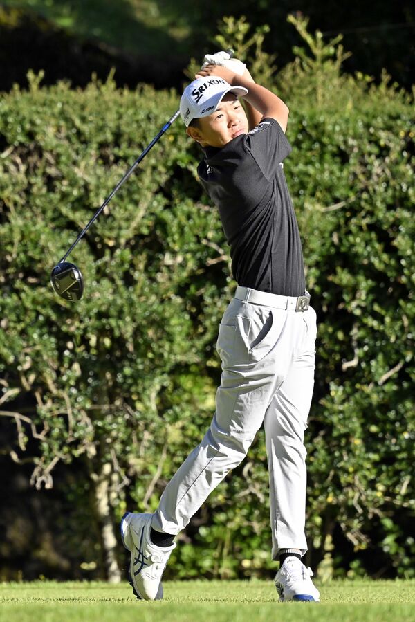 10番ティーショットを放つ一般男子の部最年少優勝の小筆(那須塩原)=芳賀CC、森田大地撮影