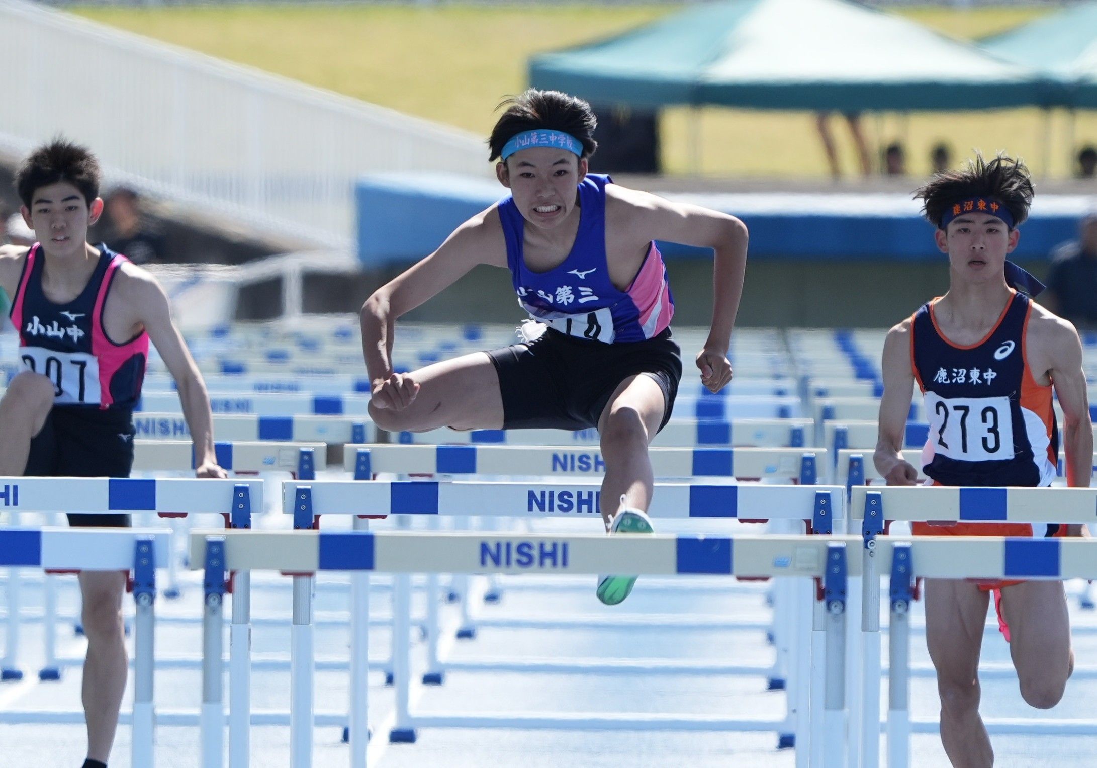 男子110メートル障害を14秒42の大会新記録で制した小山三の本川(中央)=県総合運動公園第2陸上競技場、橋本裕太撮影