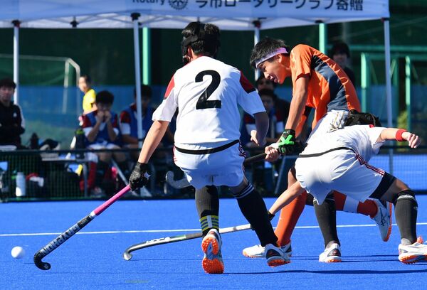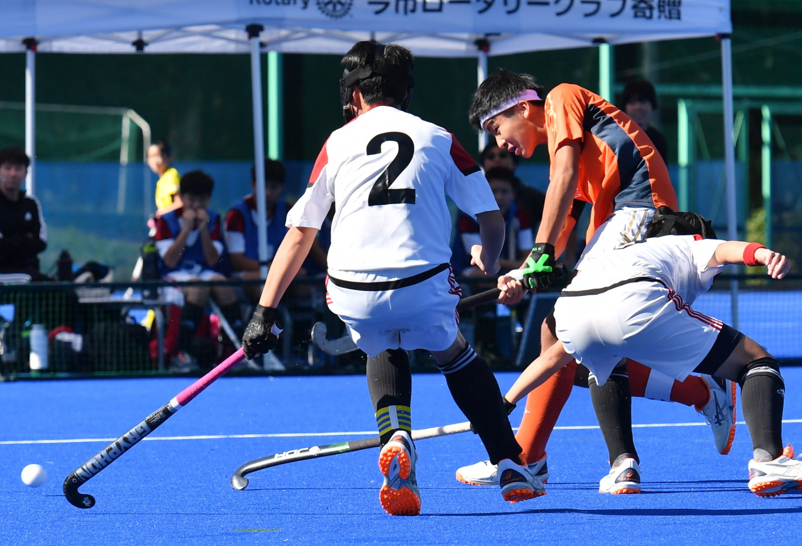 ホッケー男子決勝 第1クオーター3分、東原のMF黒子(右奥)が先制点を決める=今市青少年スポーツセンター人工芝競技場、鈴木久崇撮影