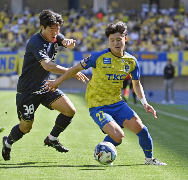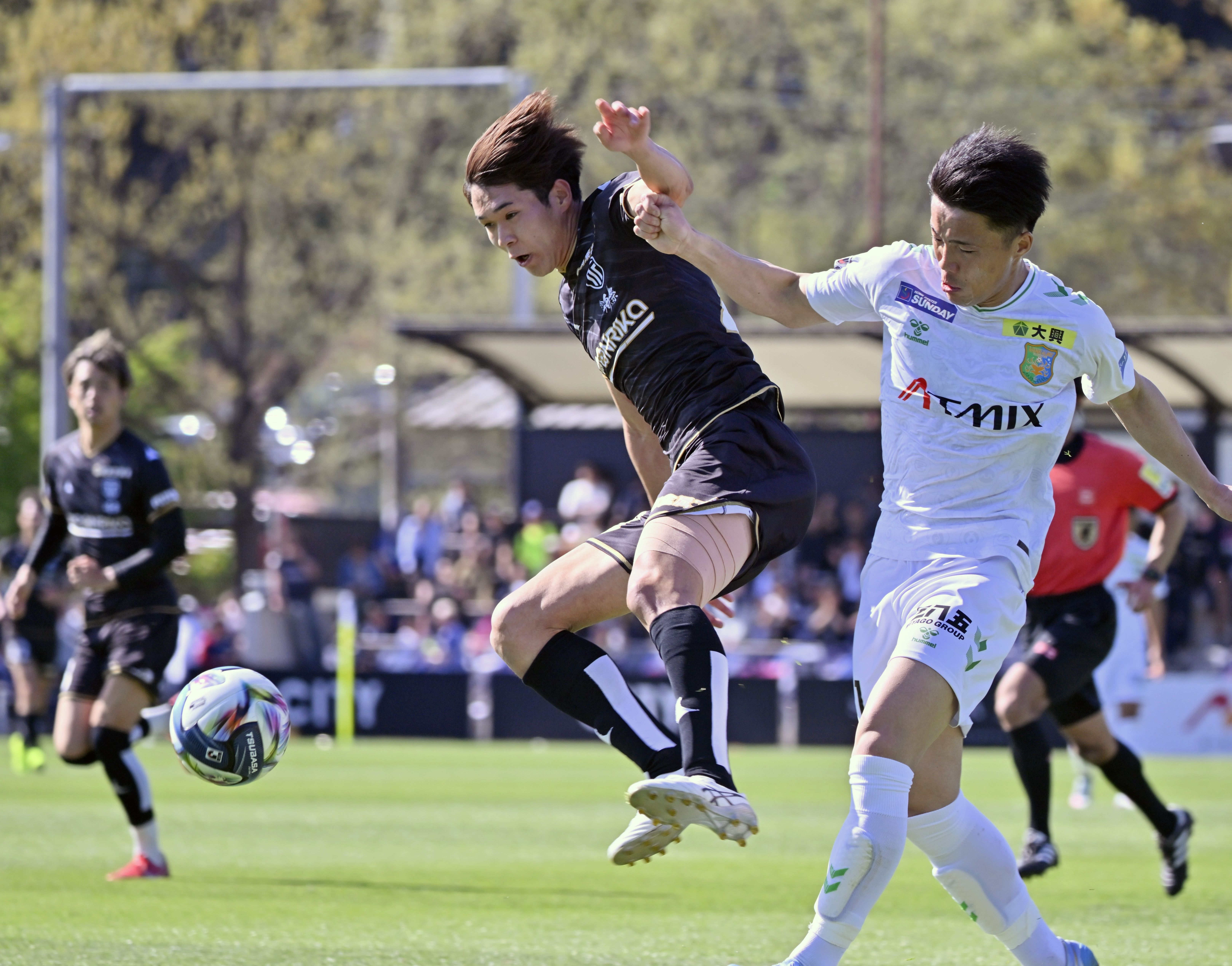 前半13分、栃木SCのMF永井(右)がコーナーで競り合う=カンセキスタジアムとちぎ、森田大地撮影