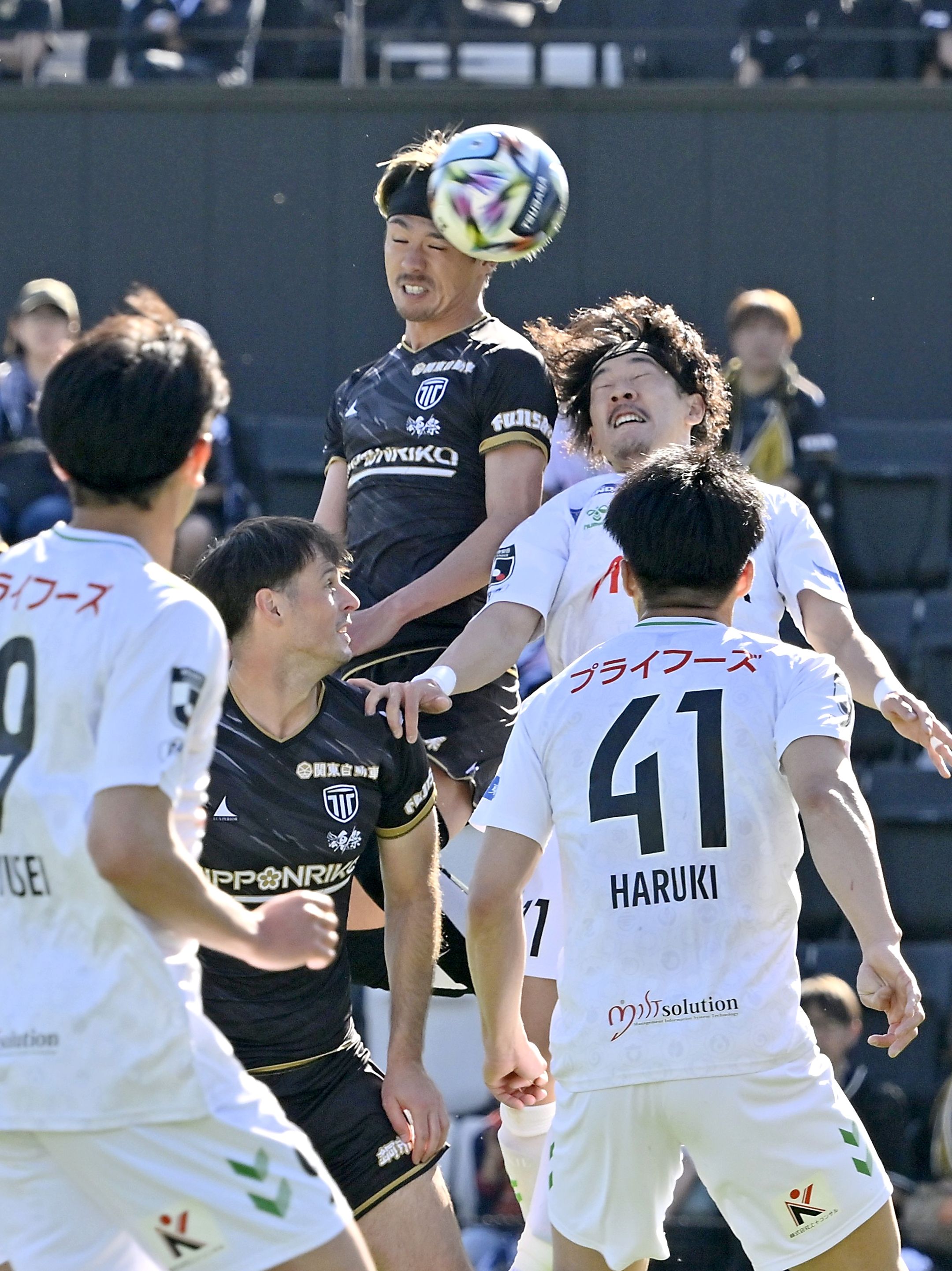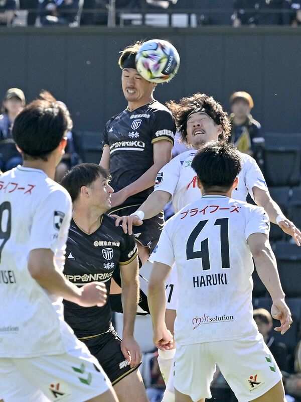 後半16分、栃木シティのDF知念(中央奥)が相手ゴール前で競り合う=CFS、加藤竜矢撮影