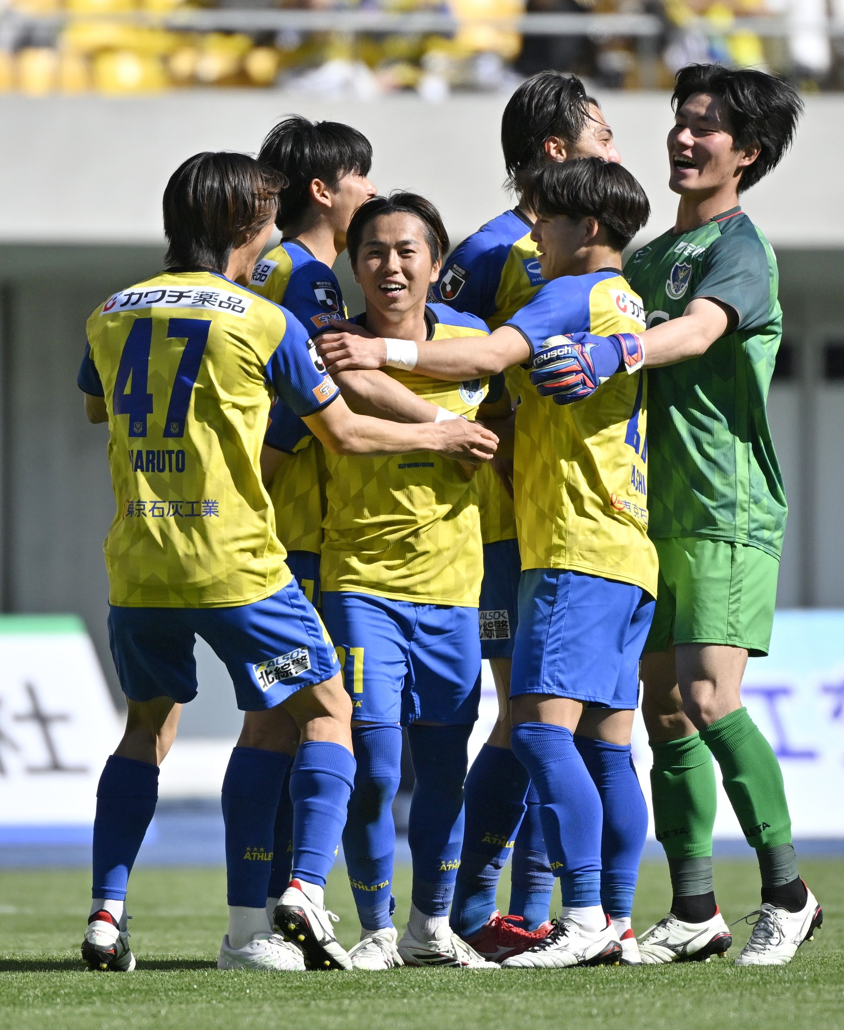 前半39分、栃木SCのMF中野(左から3人目))がゴールを決めて仲間に囲まれる