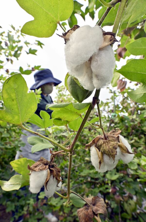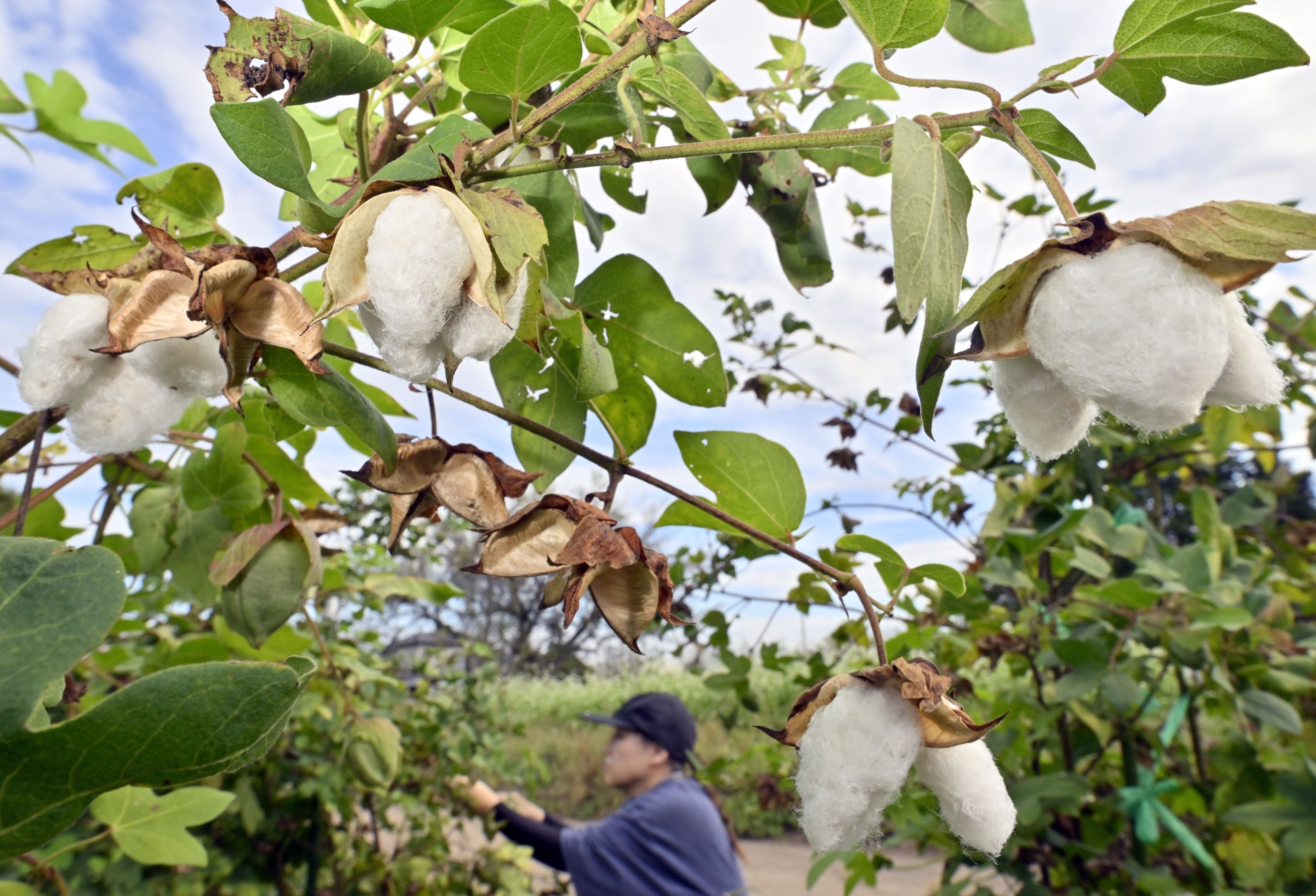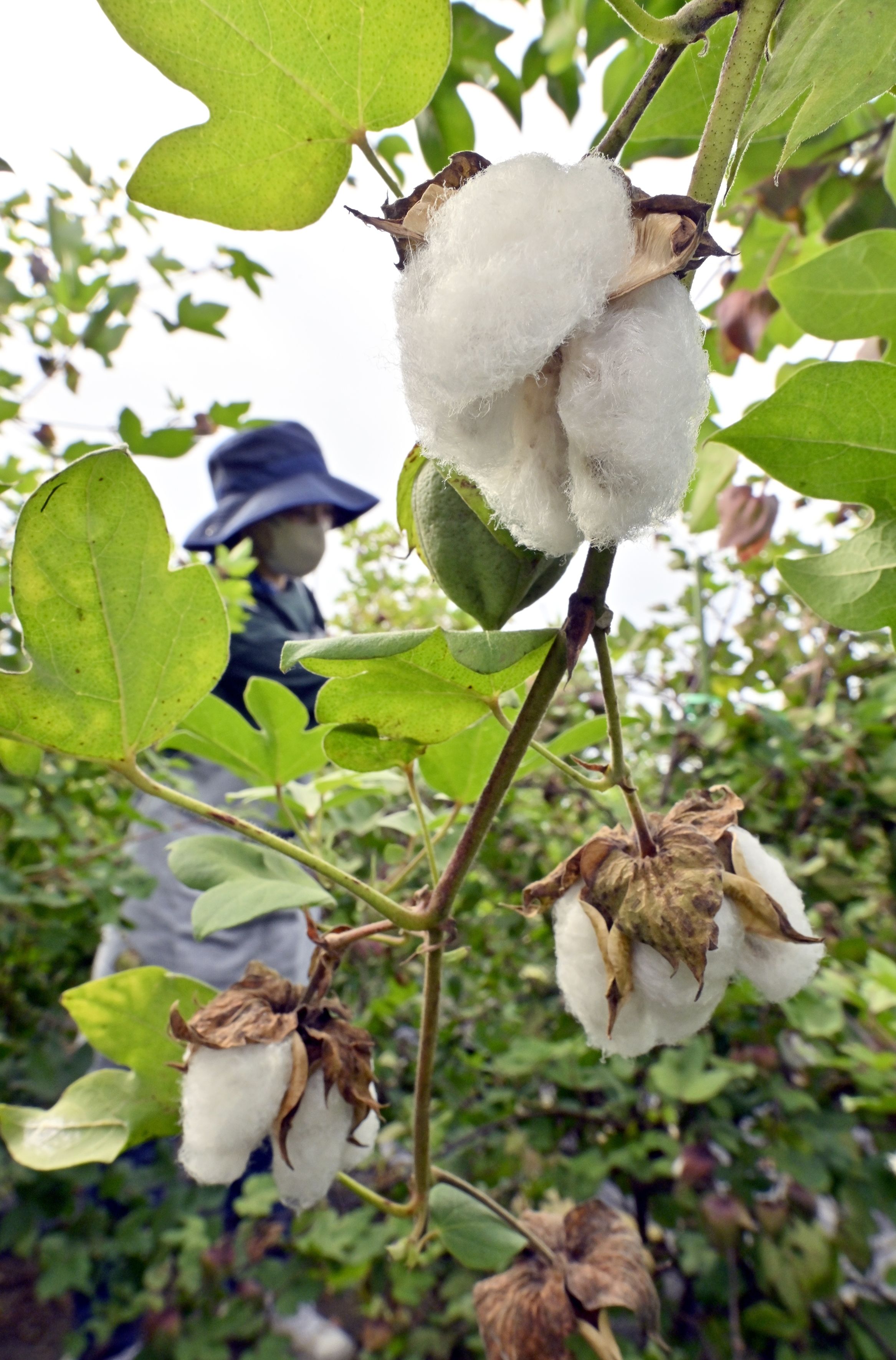 はじけた実から顔をのぞかせた真っ白な綿花=6日午後2時55分、真岡市東沼
