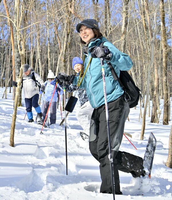 雪上散歩を楽しむ参加者たち=13日午前10時10分、那須塩原市湯本塩原