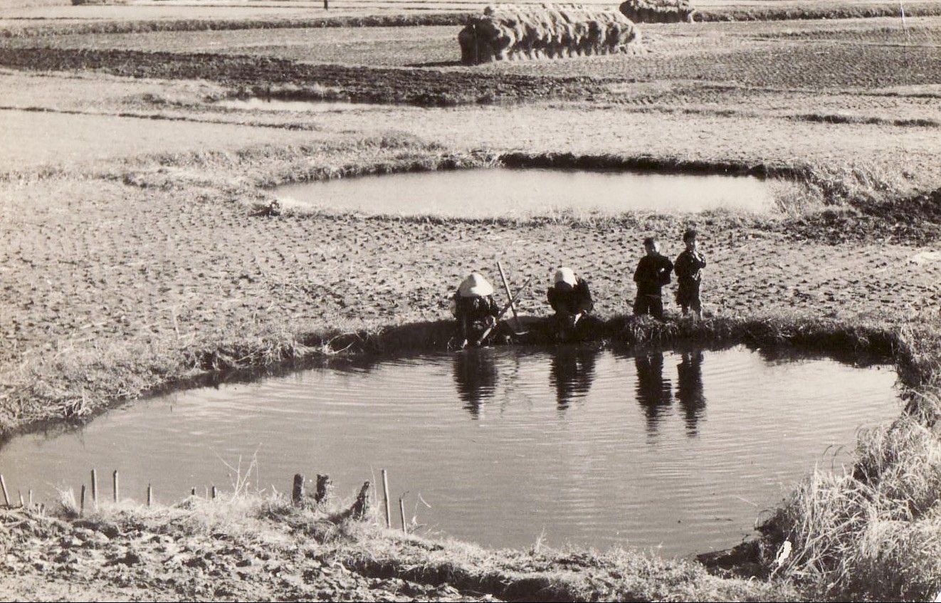 鳥栖空襲の500ポンド爆弾でできた大穴には水がたまって「ばくだん池」と呼ばれ、昭和30年代まであった=鳥栖市藤木町(1956年ごろ撮影、篠原眞さん提供)
