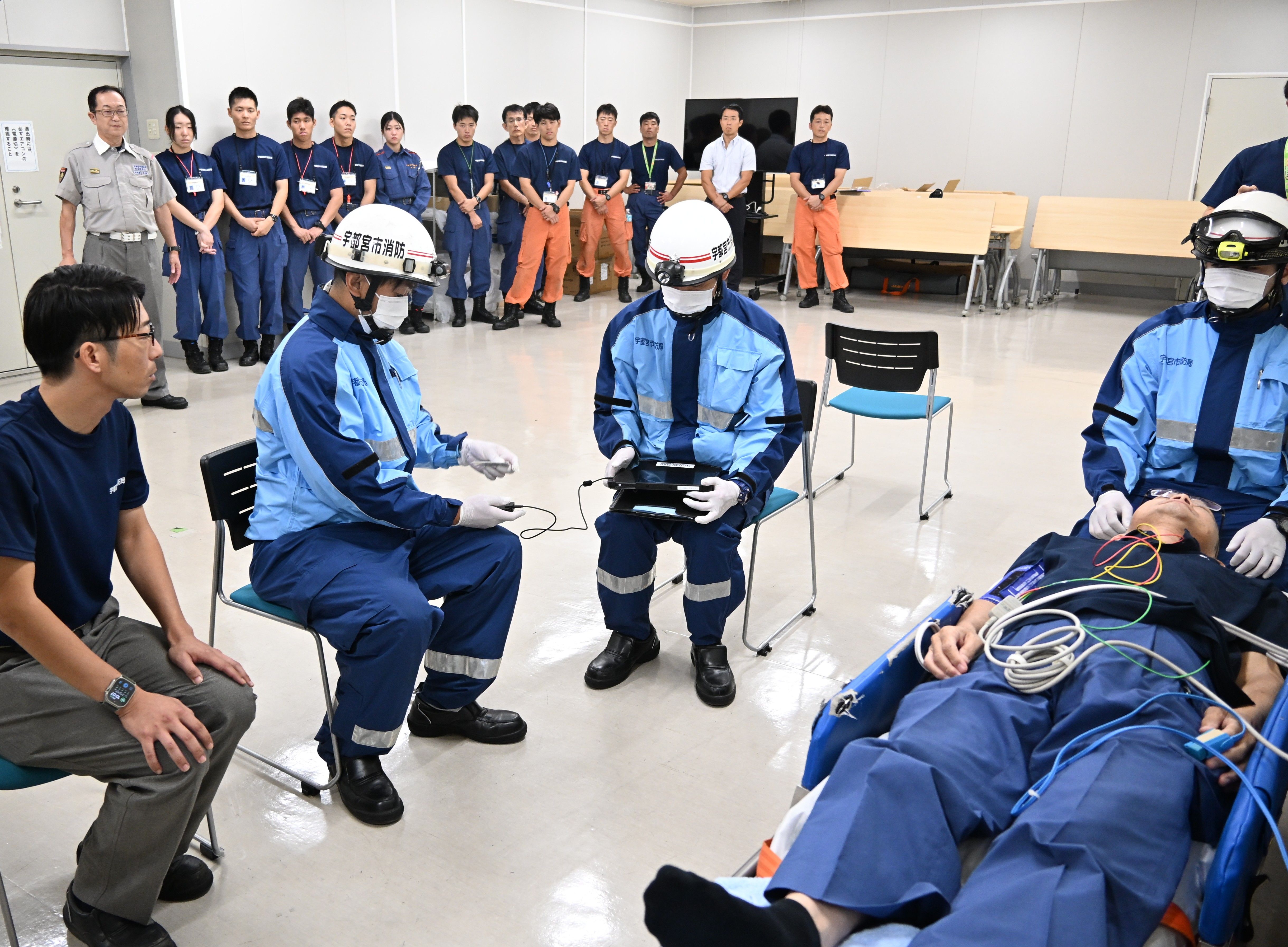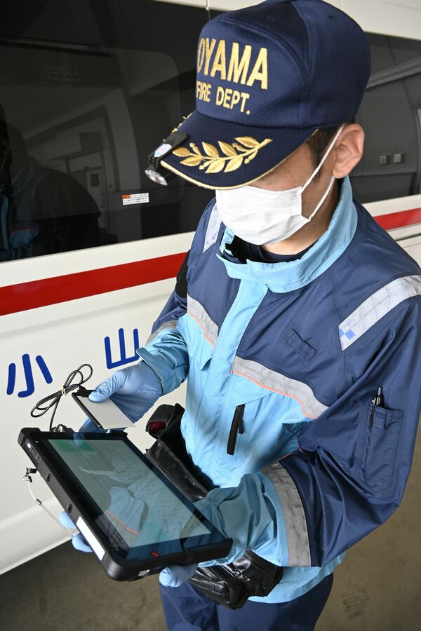 マイナ保険証の医療情報にアクセスする専用機器を操作する救急隊員=9月中旬、小山市消防本部