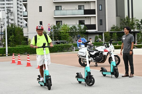 電動キックボードを試乗する市民=29日午後、宇都宮市宮みらい