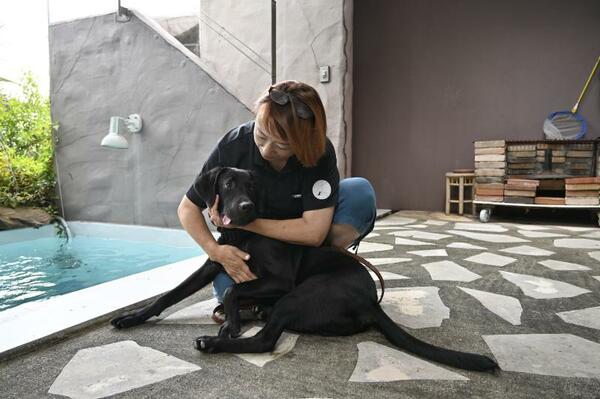 ESDのラブラドール「ジジ」と触れ合う萩原さん=宇都宮市西の宮1丁目