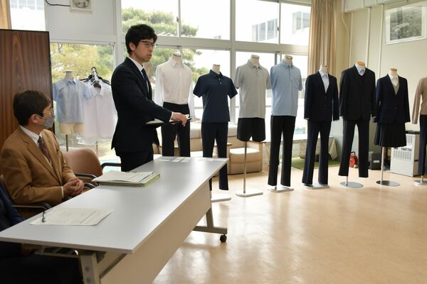 中等教育学校への再編にあたり、ユニクロ製品を取り入れた宇都宮付属高・付属中の新制服=30日午前、同校