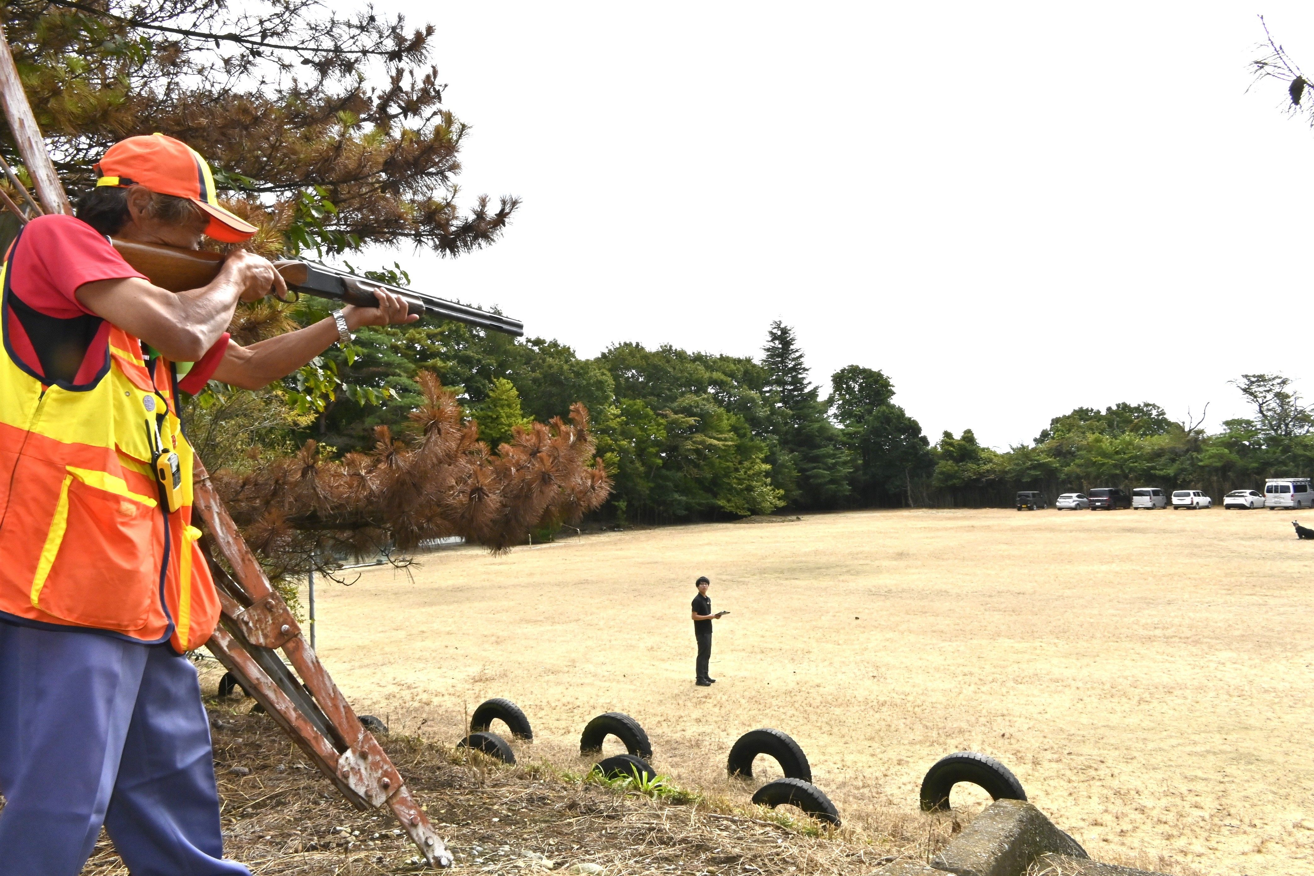 擬似銃を構える益子副支部長=29日午前10時15分、那須町高久丙